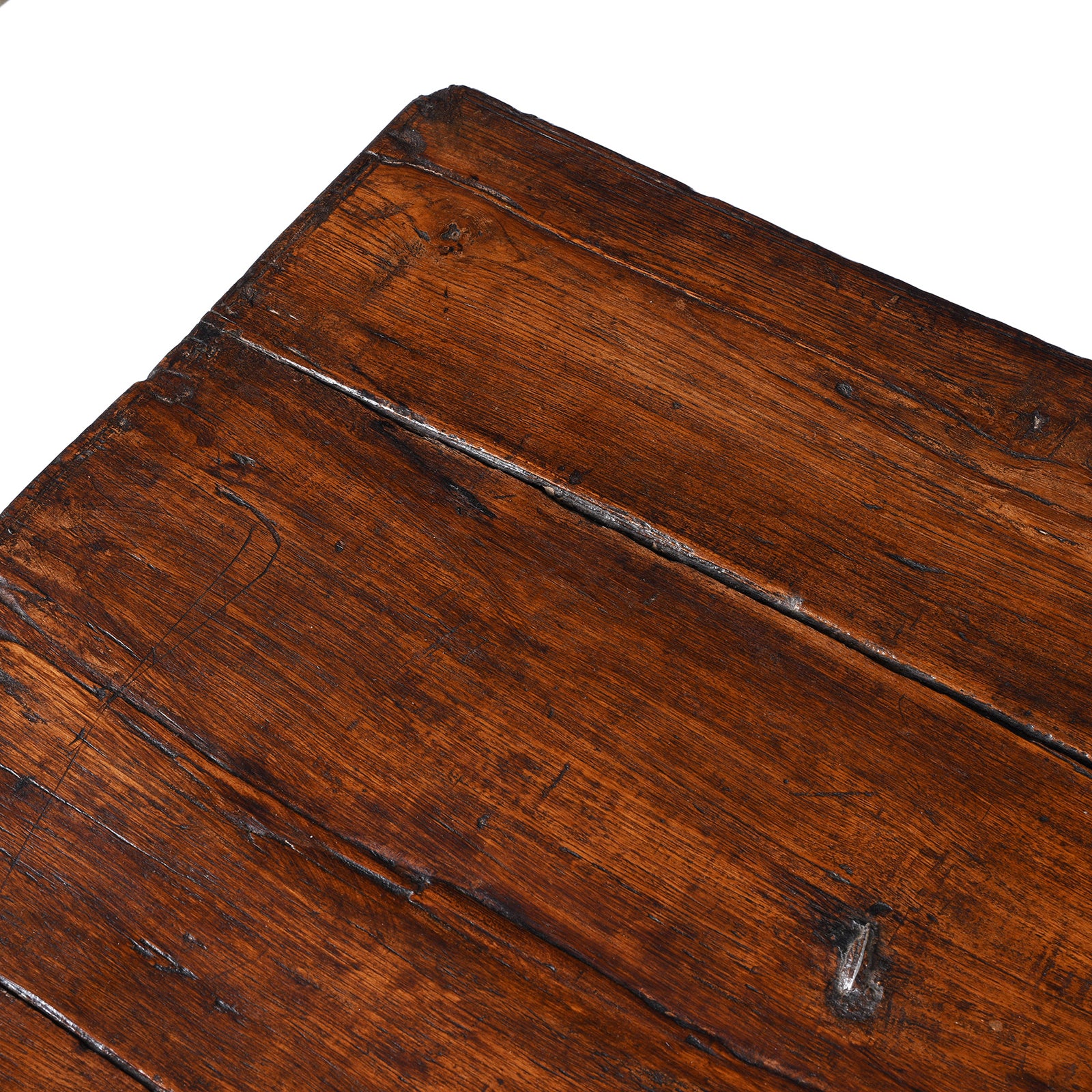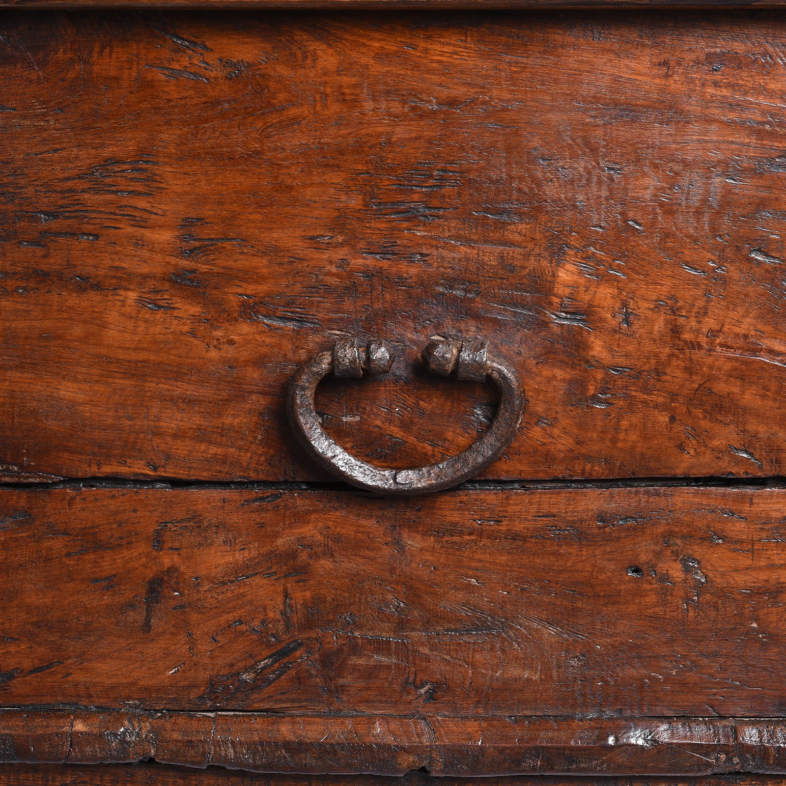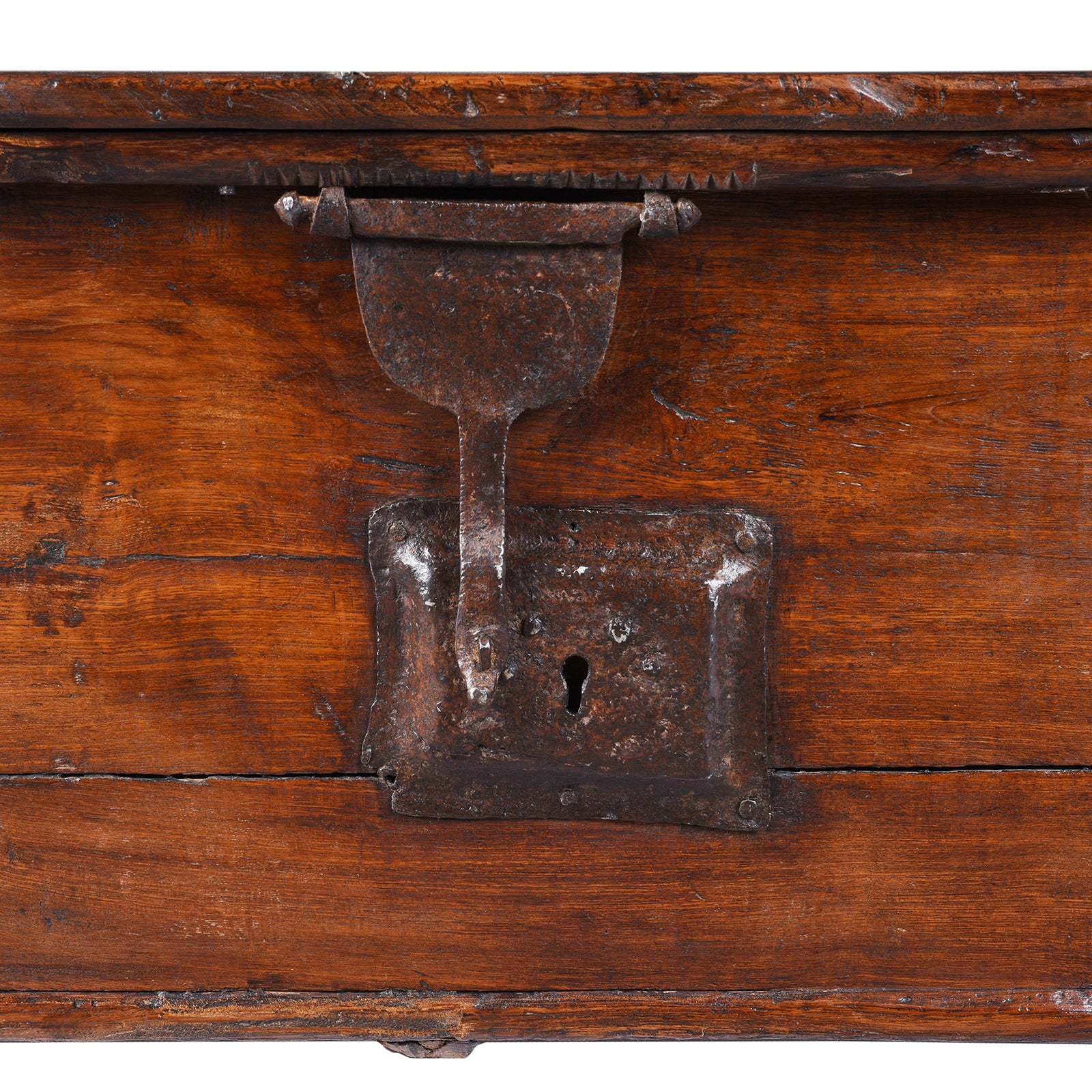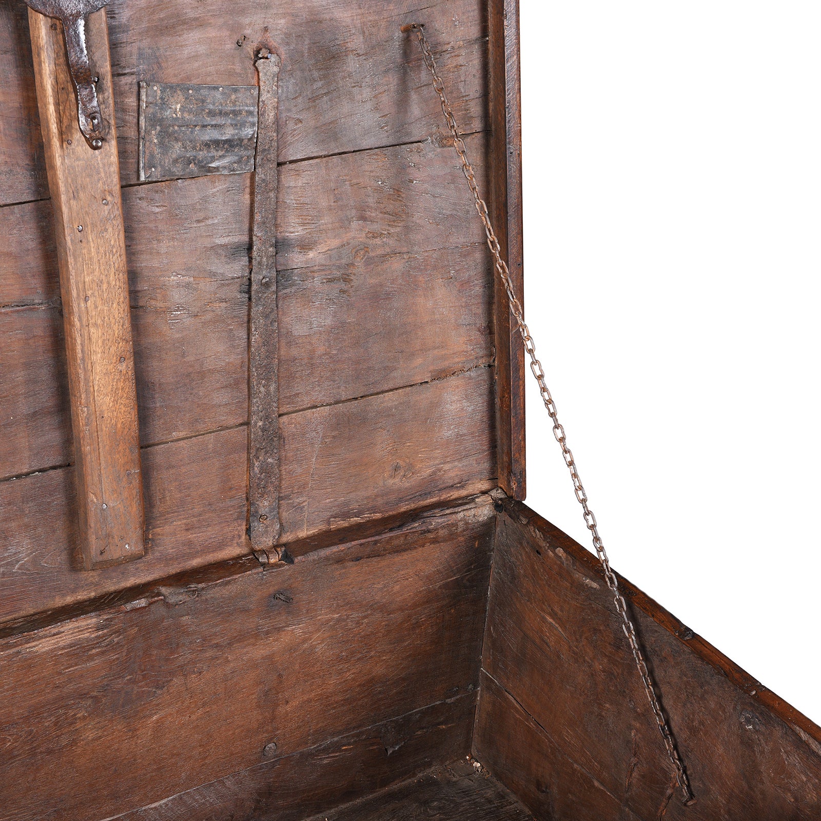 This iron bound teak chest from Goa is not only a stunning piece, but also has a rich history behind it. In the 19th century, these chests were used to store valuables such as textiles, jewelry, and cash, as it was not yet common to keep all money in banks. These strong boxes were custom-made, often commissioned by the head of the family. This particular chest boasts a beautiful patina and a sturdy design, complete with a chain to prevent the lid from falling open.