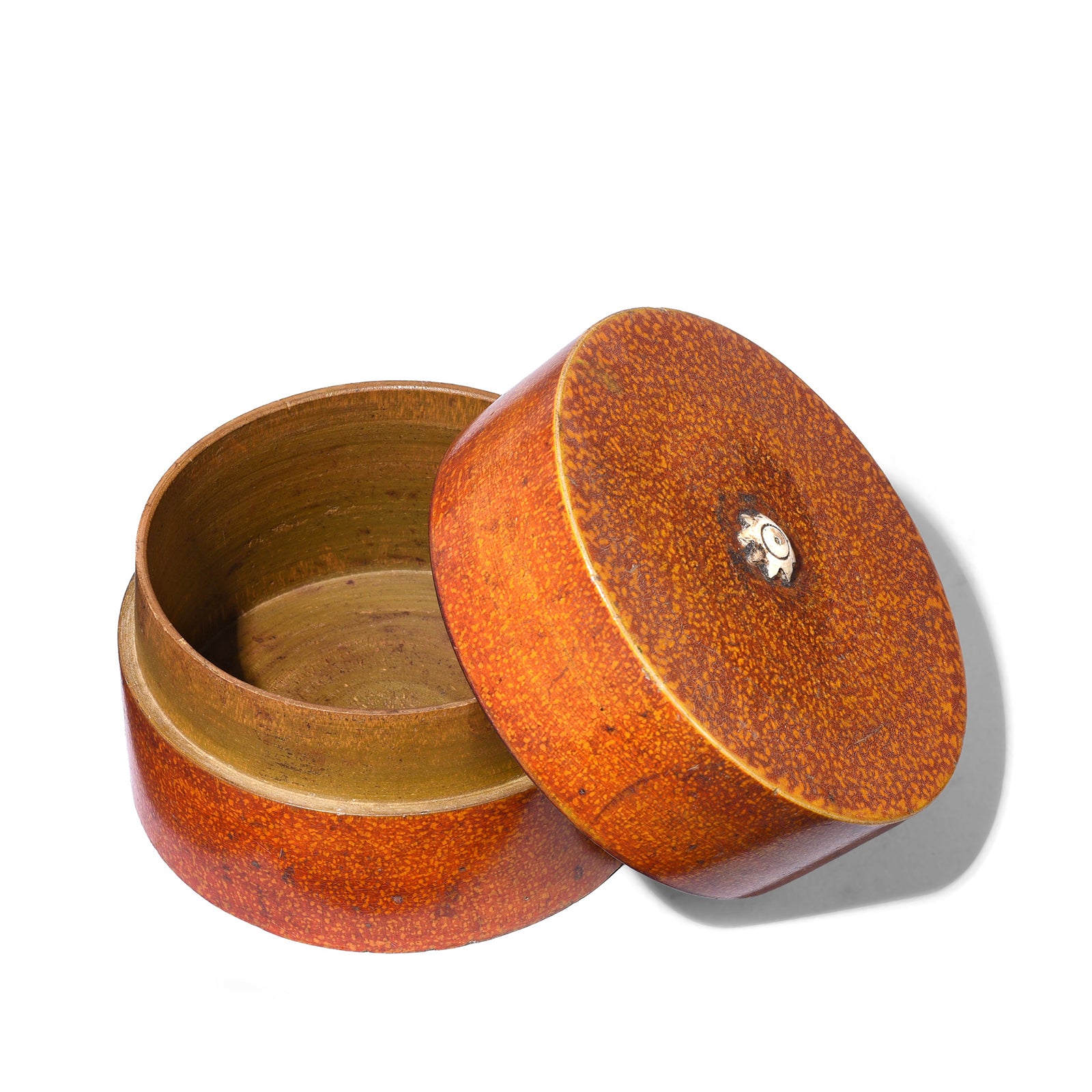 - Features: Circular form with flat lid, mottled red-orange surface, central decorative knop