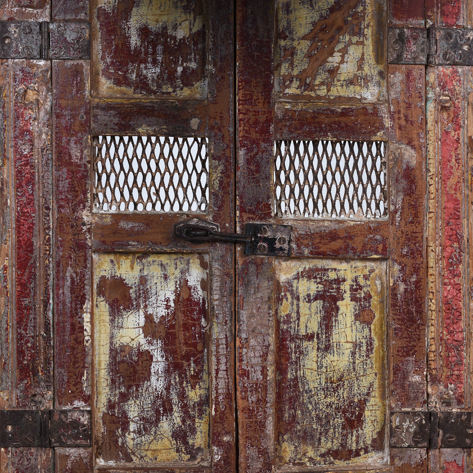 This early 19th-century painted teak house shrine from Gujarat is a finely crafted example of domestic devotion, created to enshrine a household’s favourite deity. The surface displays beautifully layered generations of paint in deep reds, ochres, creams and traces of verdigris, giving the piece a wonderfully time-worn patina. The central doors open to reveal the sanctum where the deity figure would have been placed, offering a glimpse into the intimate spiritual life of a Gujarati home.