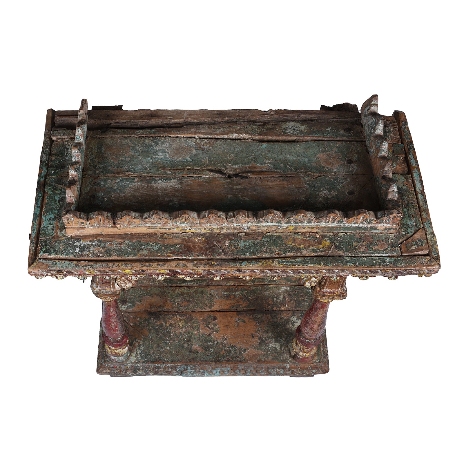 Architecturally, the shrine shows strong Mughal influence in its cusped arch, pierced brackets and ornate foliate carving. The turned front columns add graceful verticality and retain fragments of their original polychrome. Designed to be easy to assemble and disassemble, shrines like this were sometimes moved between rooms or taken on family journeys.