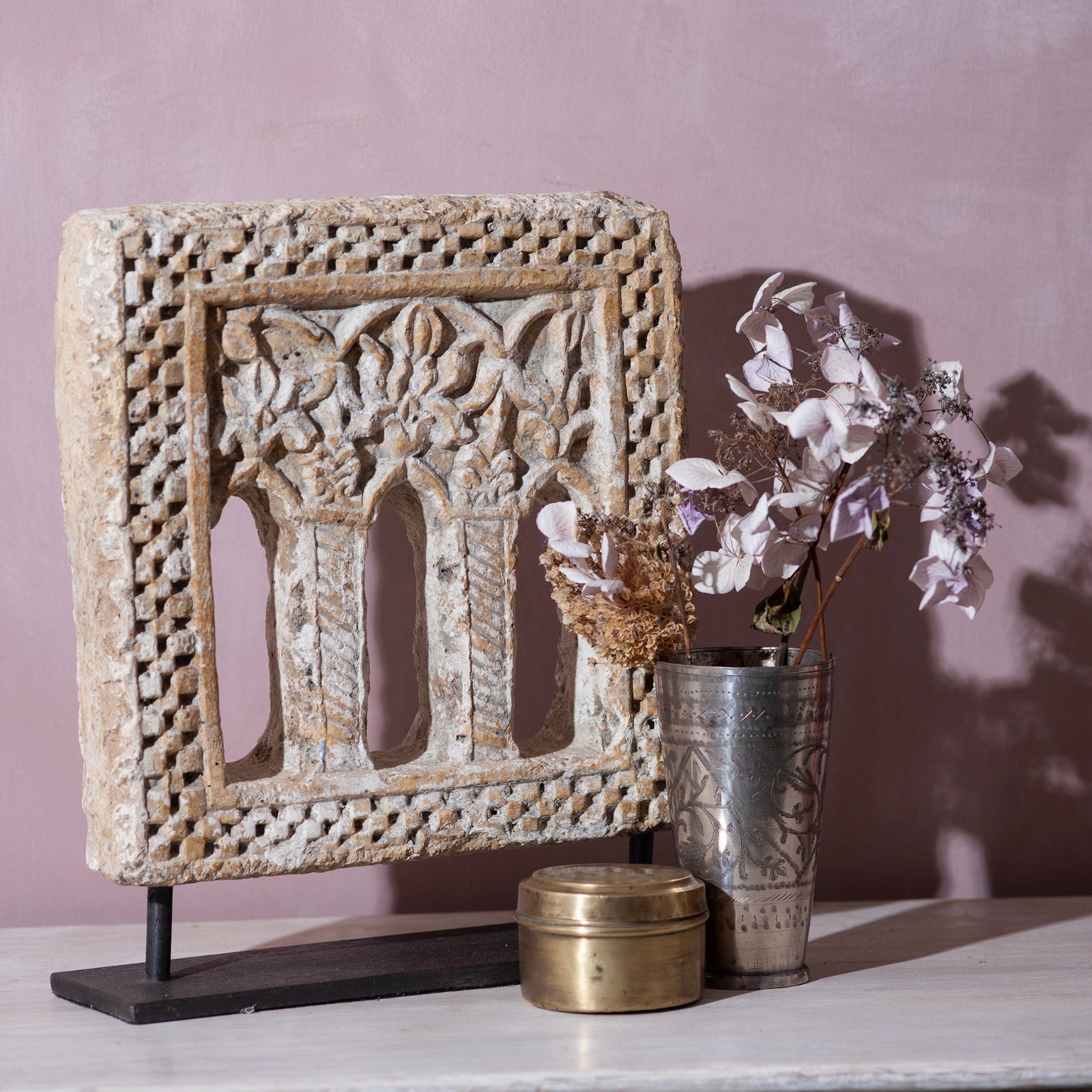 Now mounted on bespoke black metal stands, these architectural fragments serve as sculptural decor€”offering texture, history, and a warm sense of cultural heritage.