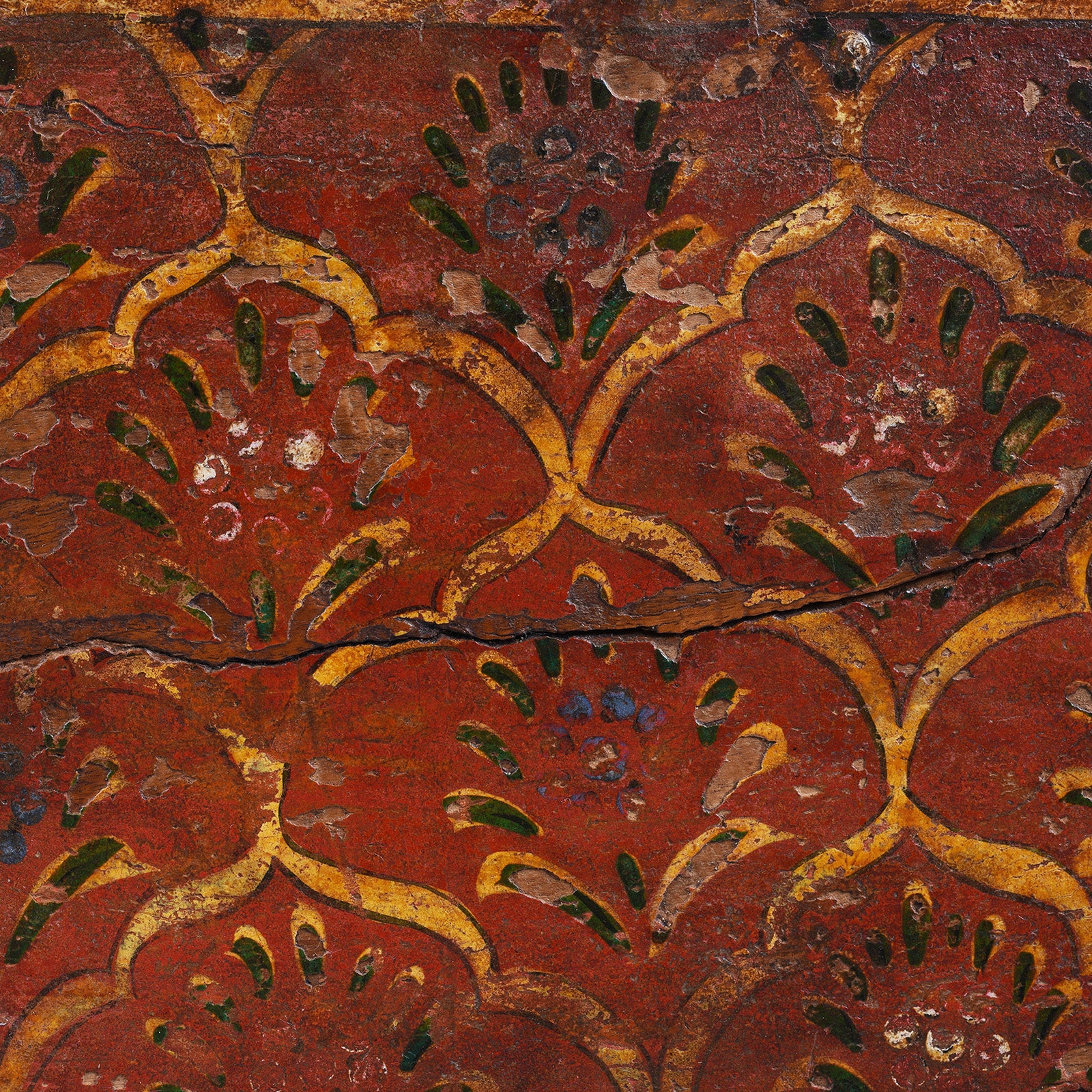 This early 19th-century painted box from Shekhawati in northern Rajasthan is now a rare thing to find and a beautifully preserved example of traditional Rajasthani craftsmanship. Made from teak and decorated with its original deep red and ochre polychrome, the box features scrolling floral motifs characteristic of the Shekhawati region. The paint has worn naturally over time, creating a richly textured surface with wonderful patination.