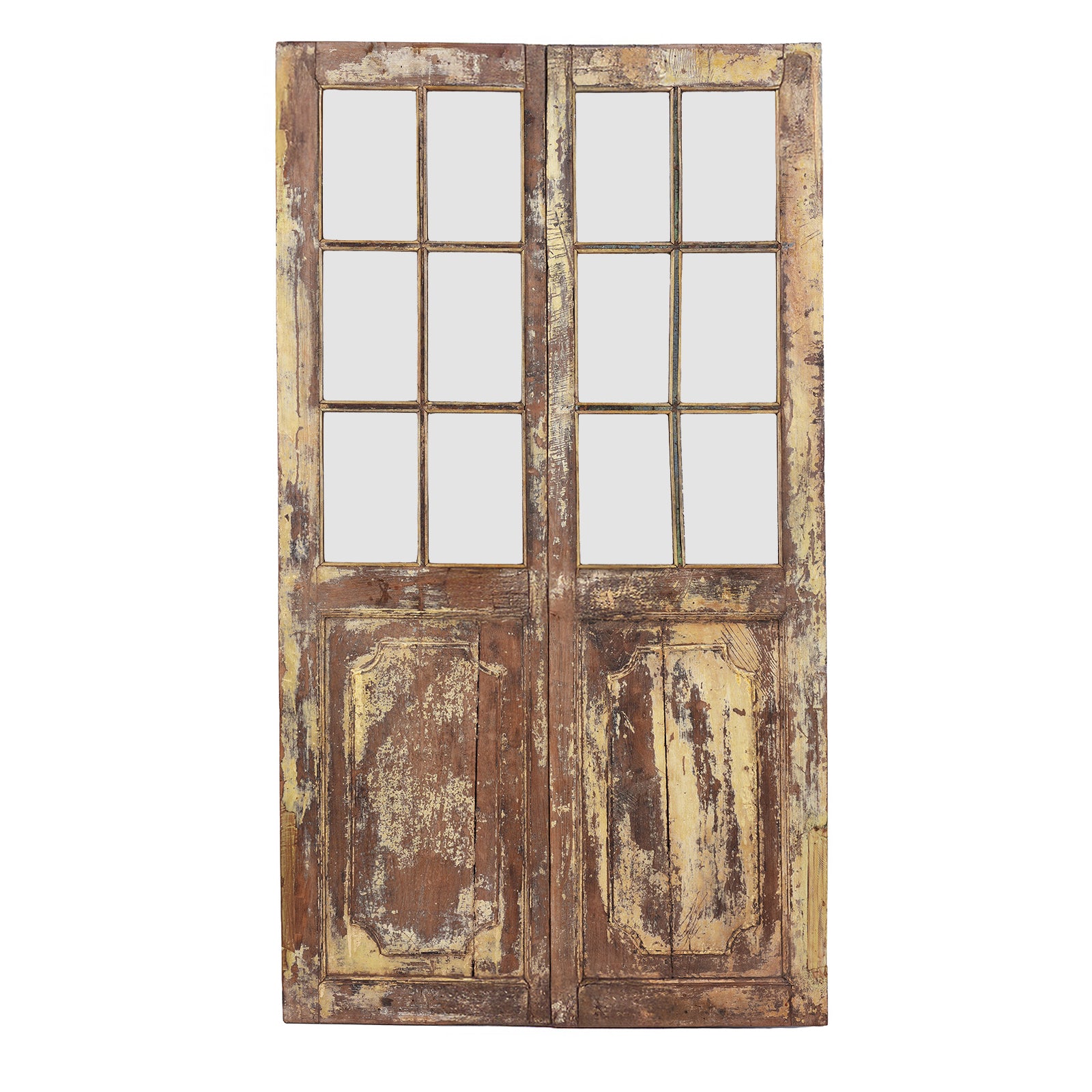 This charming yellow-painted double door has been salvaged from an old building in Gujarat and retains its original, beautifully distressed surface. The layers of worn paint reveal decades of use and exposure, creating a wonderfully textured patina that cannot be replicated. The upper sections are fitted with multiple glass panels, allowing light to pass through freely and making the doors ideal for spaces that benefit from brightness while still retaining architectural character.