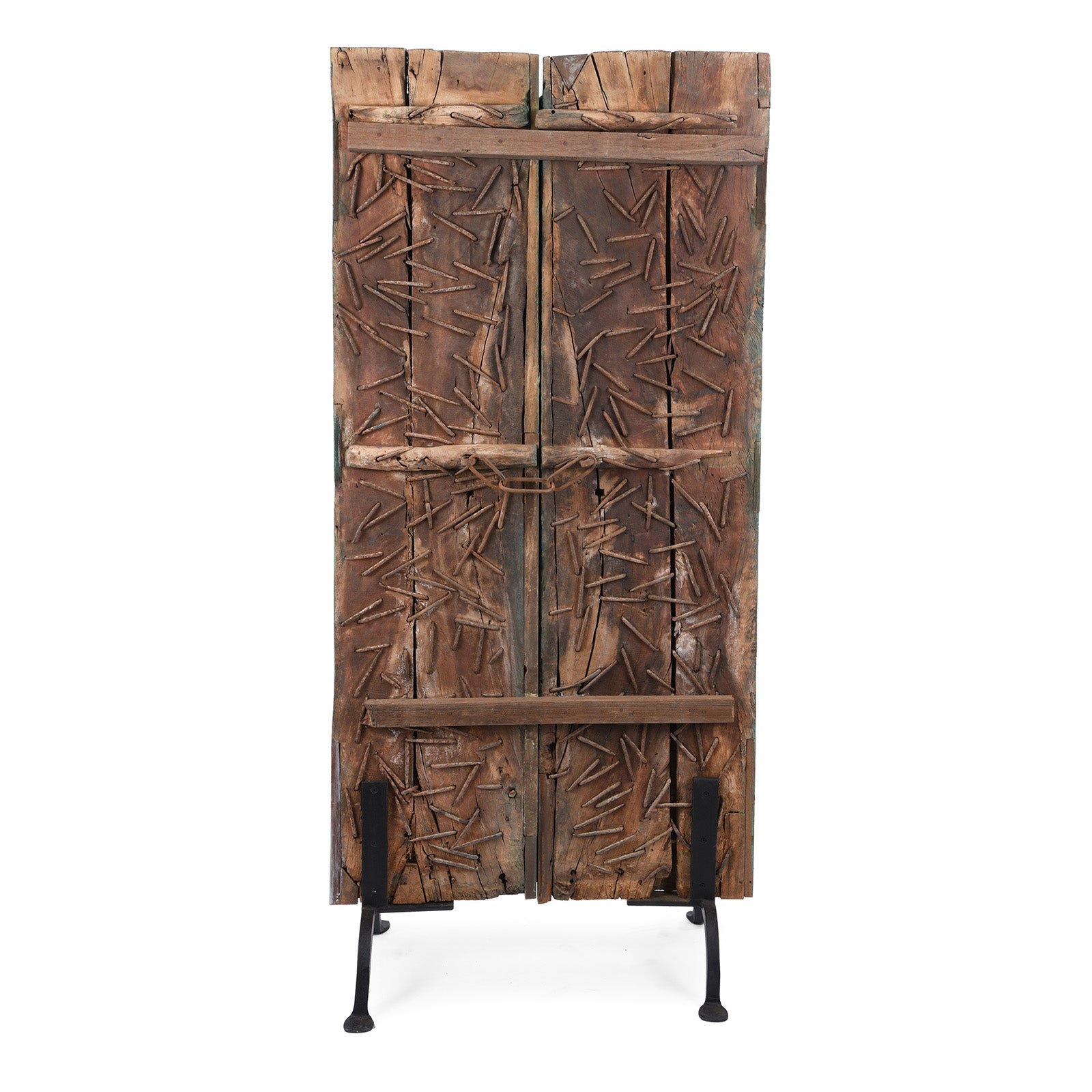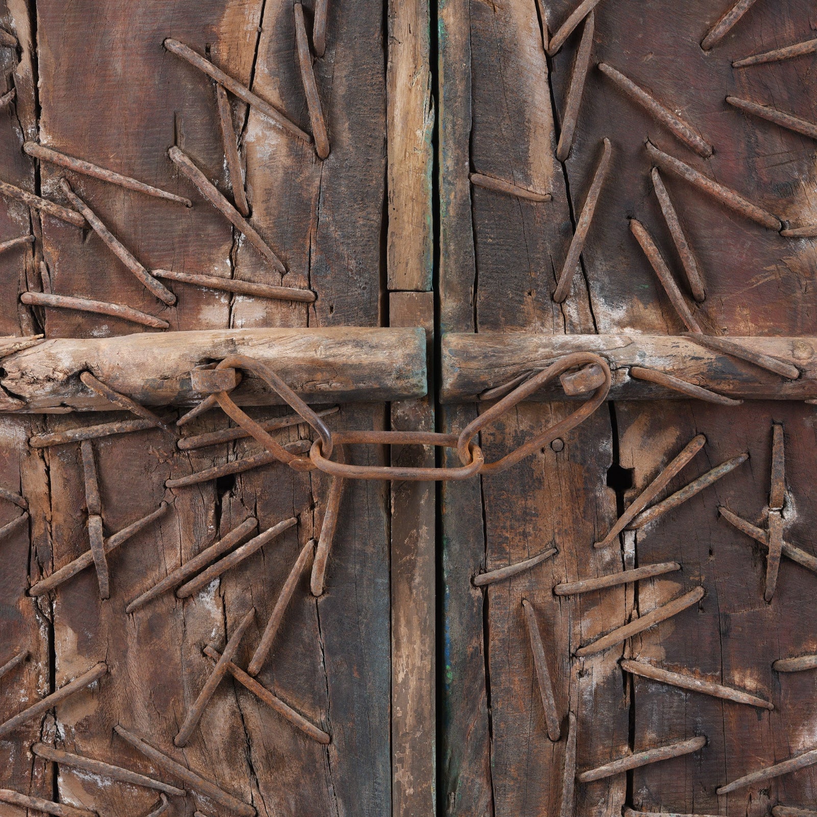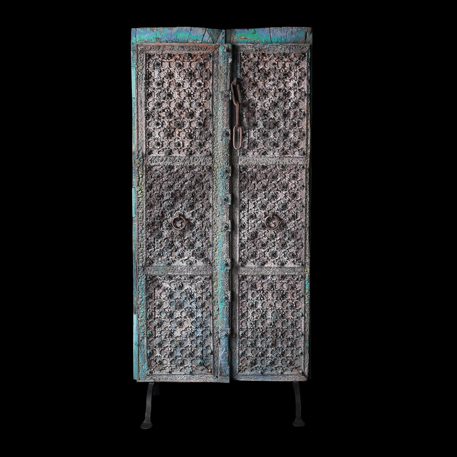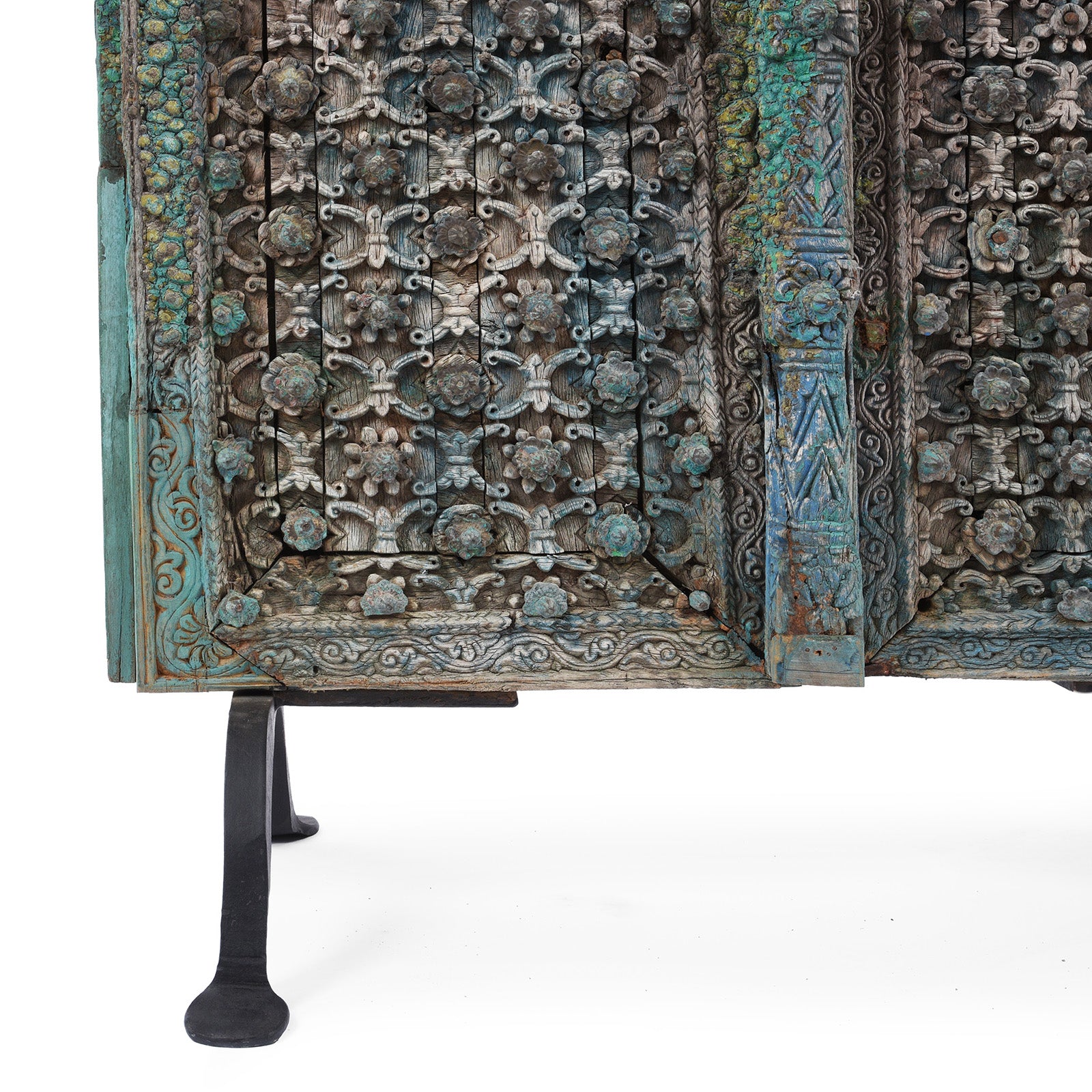 This incredible carved Mughal studded door is from the Uttar Pradesh in Northern India. Its deep carvings suggest this to be an early piece and the bubbled green paint can only be achieved by years of exposure to hard sun. This door would have been an external door to a courtyard and we would suggest this incredible door is hung on a wall as art. This door is currently fixed to a stand, however we can fit wall hangers in our workshop for you. Please let us know how you'd like this hung at time of ordering.