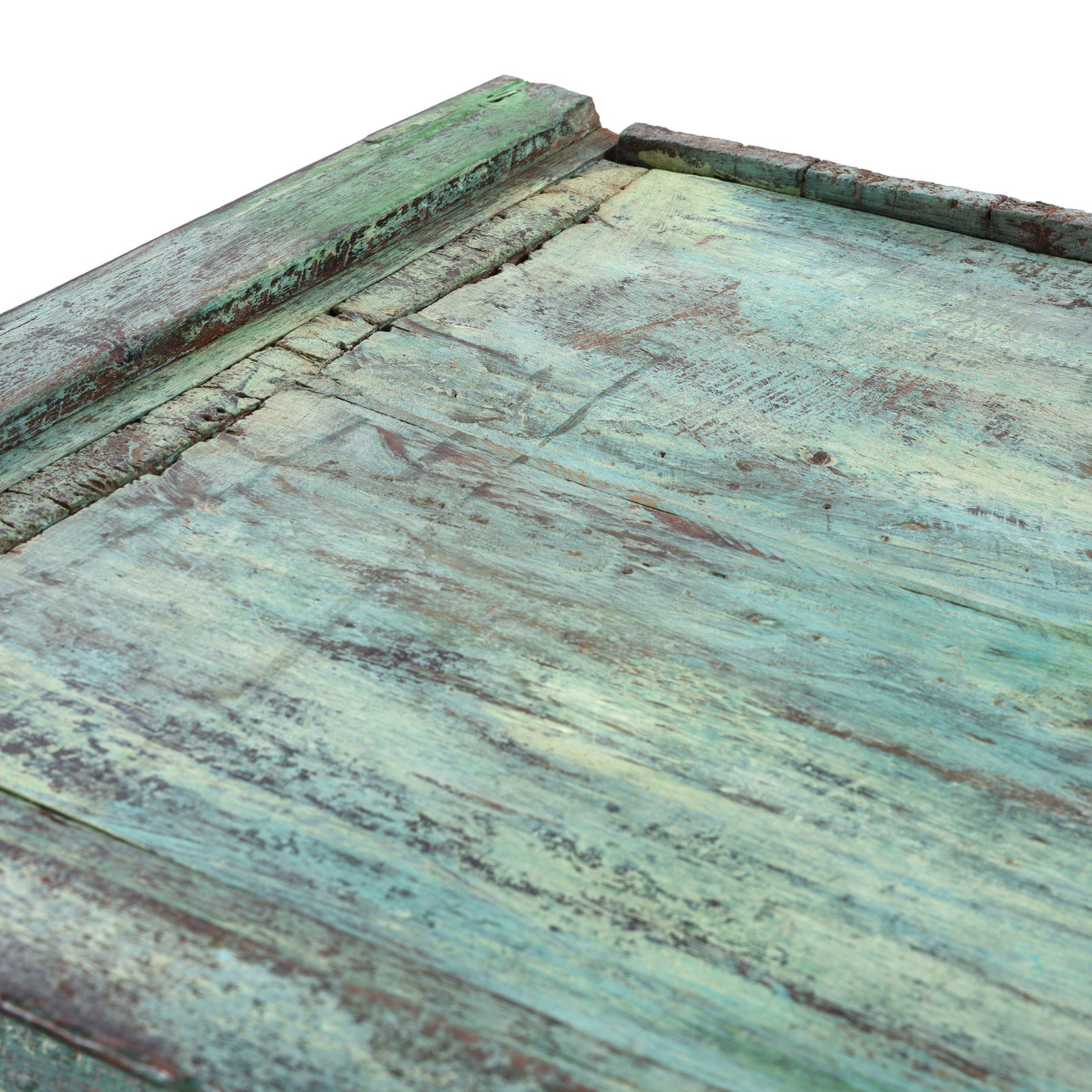 This painted Indian sunburst almirah cabinet is beautifully carved and dates to the 19th century. Many Indian cabinets were originally recessed into walls and freestanding cabinets are less common. It is constructed from green painted teak wood with light crackling, which gives a wonderful texture. Additional character comes from old metalwork patches found on the side of this piece.