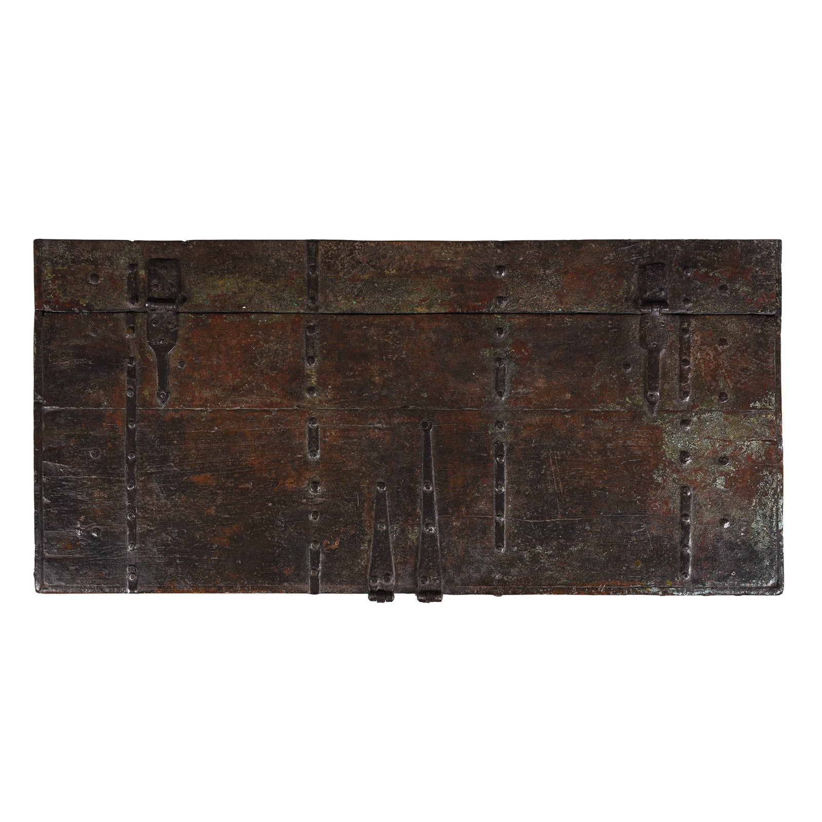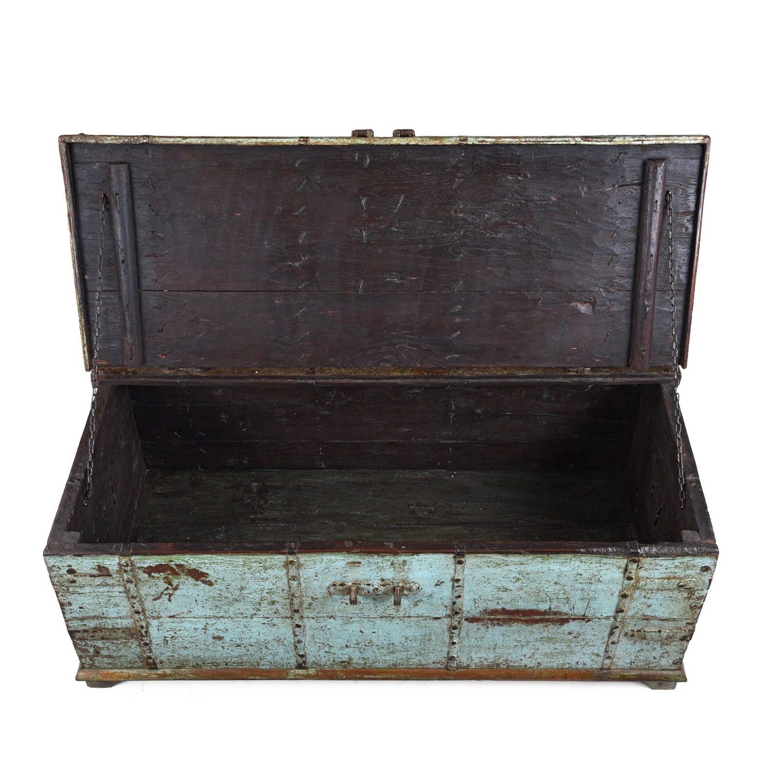 The surface retains its original layered paint in shades of blue and green over rich brown teak wood, now softly faded and distressed, creating a naturally timeworn aesthetic full of depth and texture. The iron strapwork and corner brackets add both reinforcement and visual rhythm, while two shaped iron hasps remain in place on the front.