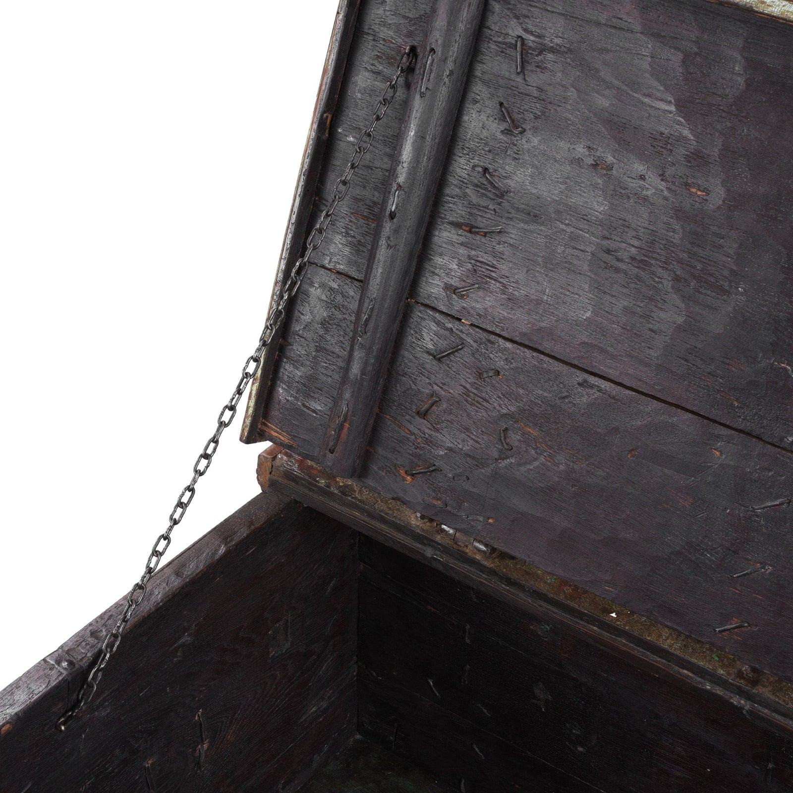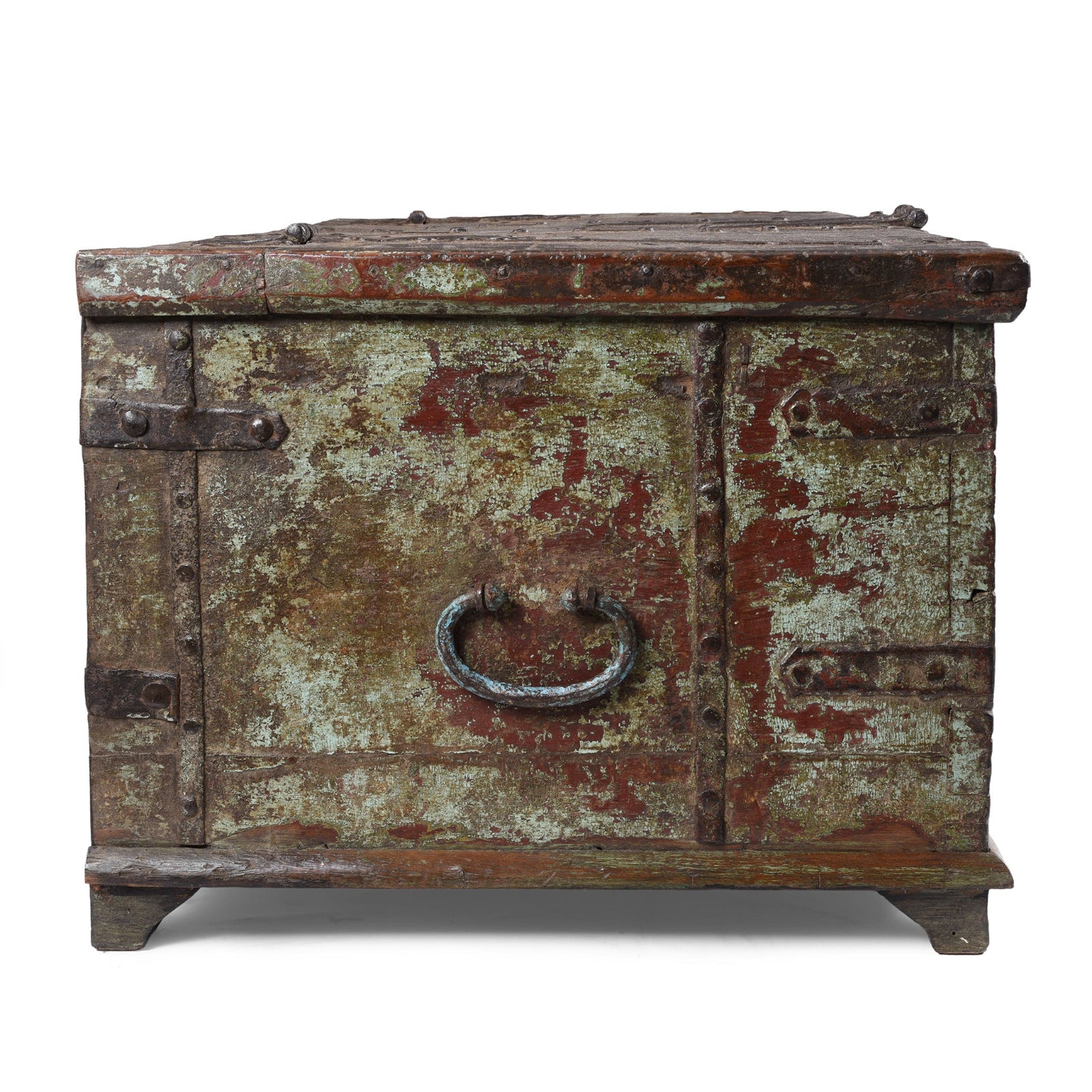 Beautifully worn and richly patinated, this 19th-century painted antique Indian teak chest from Gujarat is a striking example of rural craftsmanship. Once used in village households for storing grain, textiles, or valuables, its sturdy proportions and weathered finish evoke generations of practical use and quiet beauty.