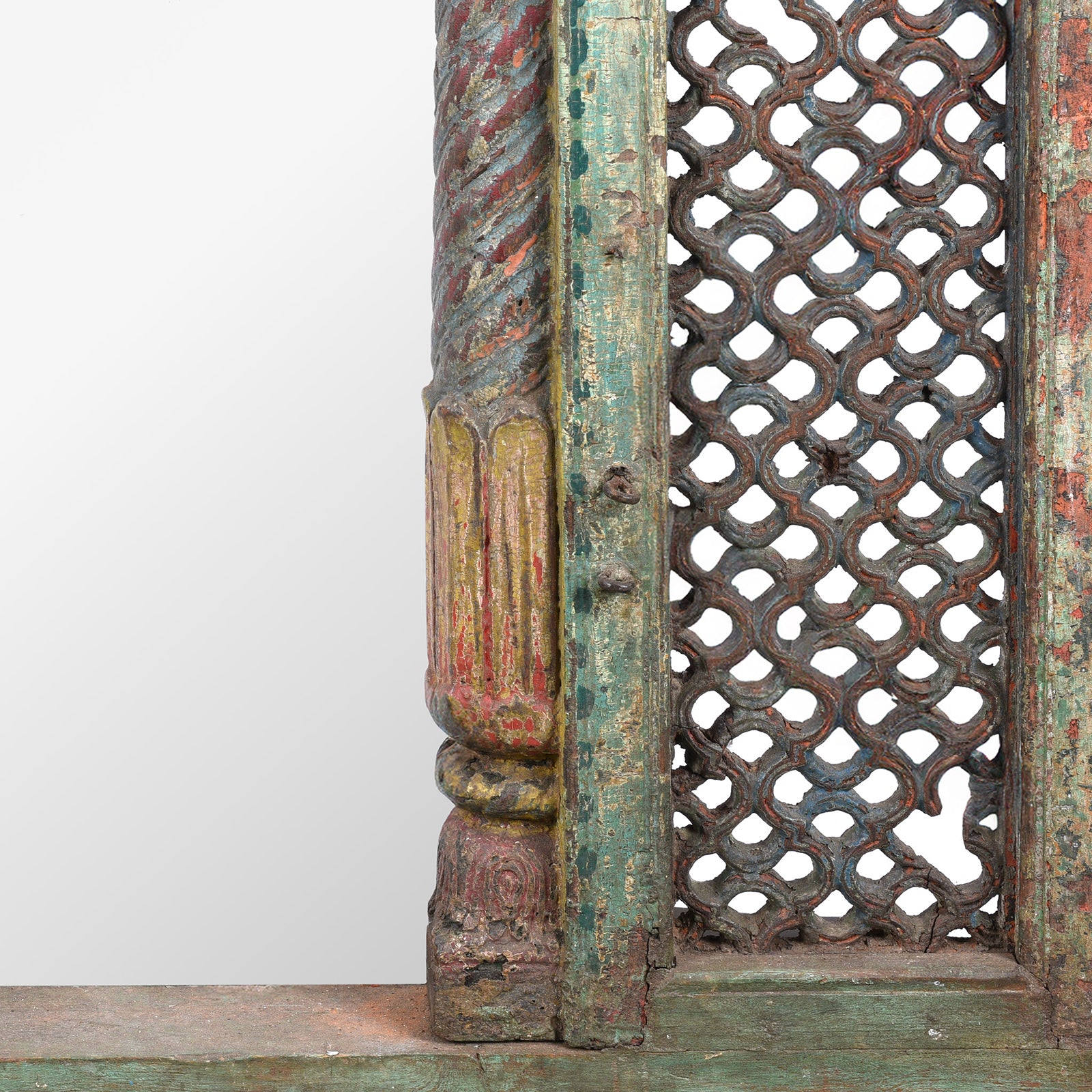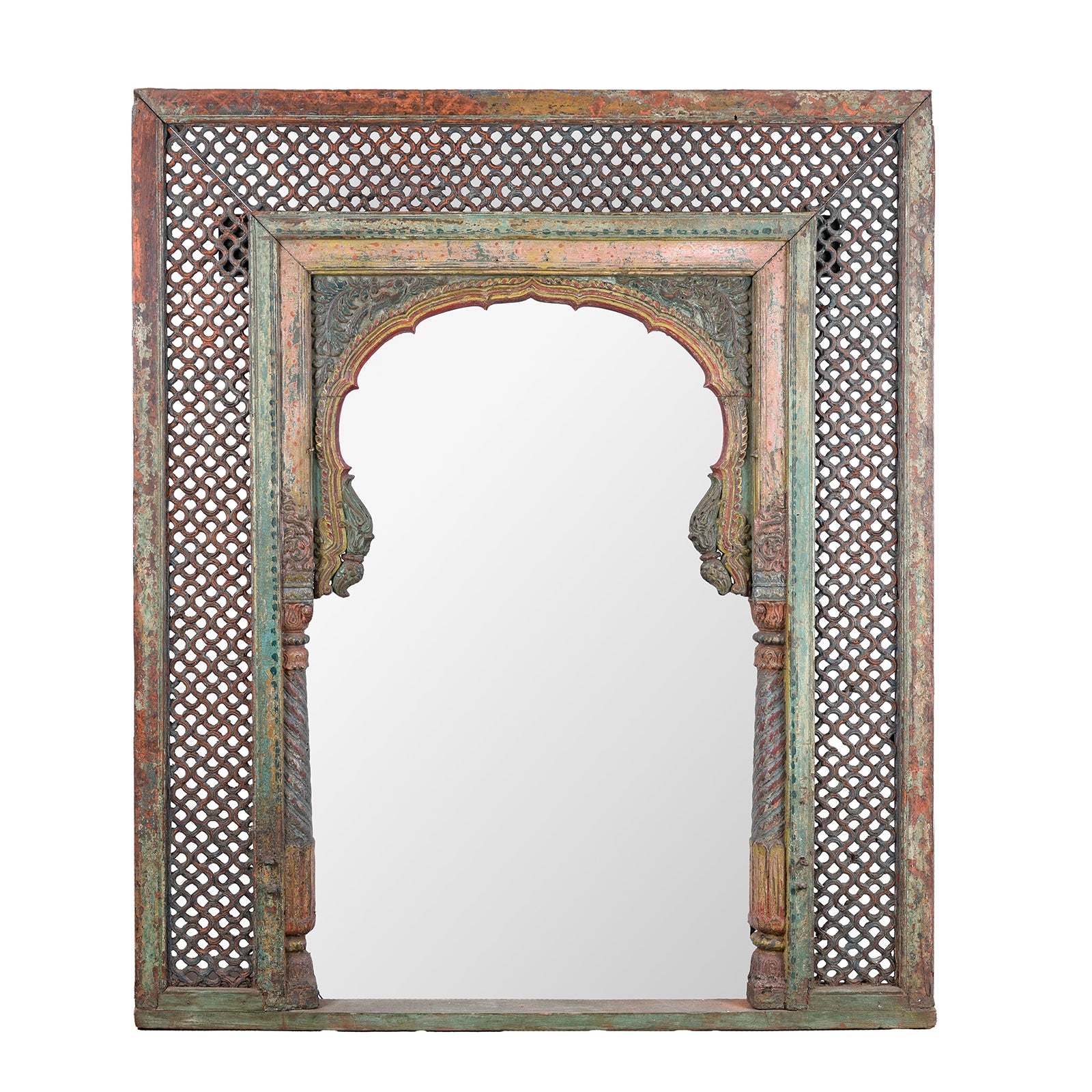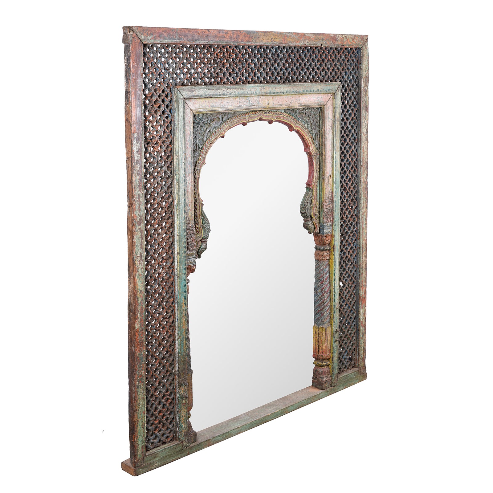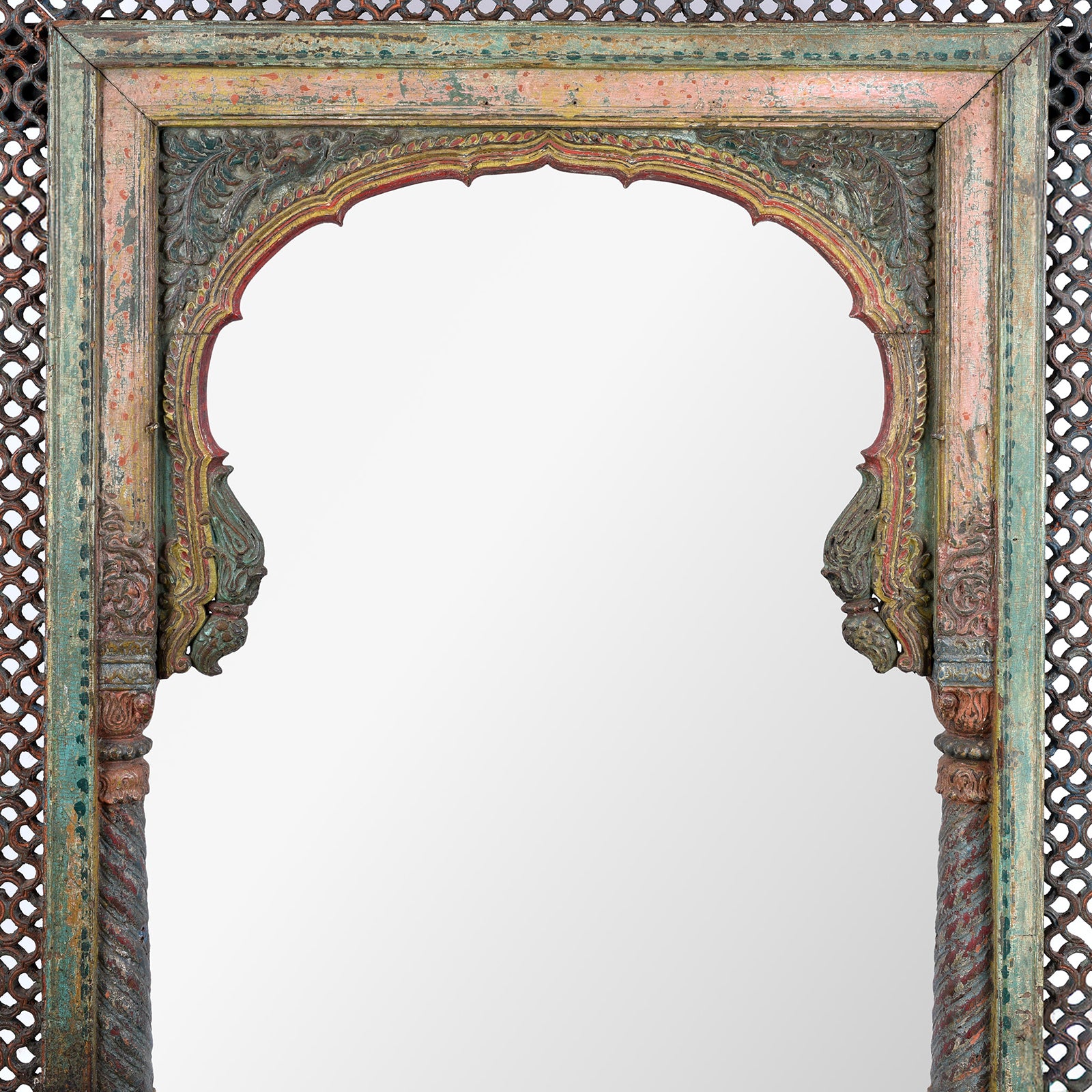 This exquisite Mughal-influenced mirror, originally a window from Banswara in southern Rajasthan, features an elegantly carved Mughal arch surrounding the reflective glass. The architectural piece is distinguished by its traditional Indian jali lattice framework, complemented by a delicate palette of pastel hues and subtle remnants of original painted motifs. Dating to the 19th century, this teak artifact represents an authentic specimen of historical Indian craftsmanship.