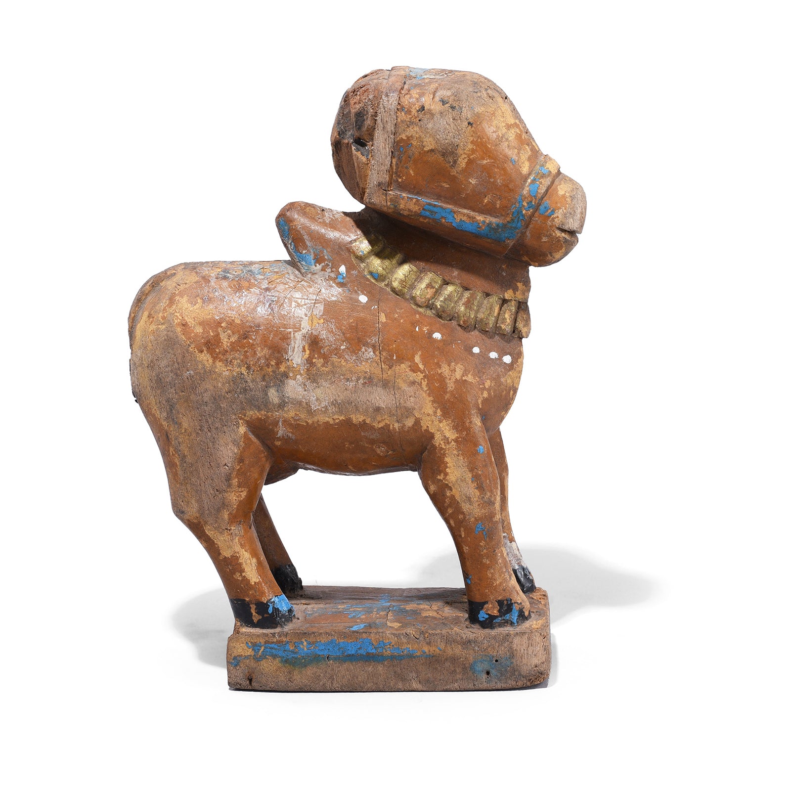 This old carved and painted Indian Nandi bull toy is from Andhra Pradesh and is made from teak wood. it dates to the 19th century. The Nandi bull is a symbol of Lord Shiva and cows are still revered and continue to wander the streets in India.