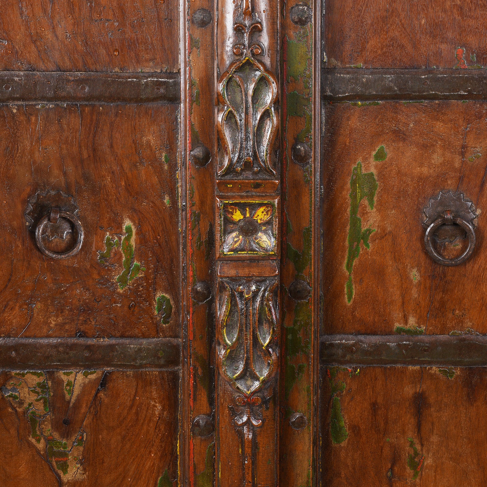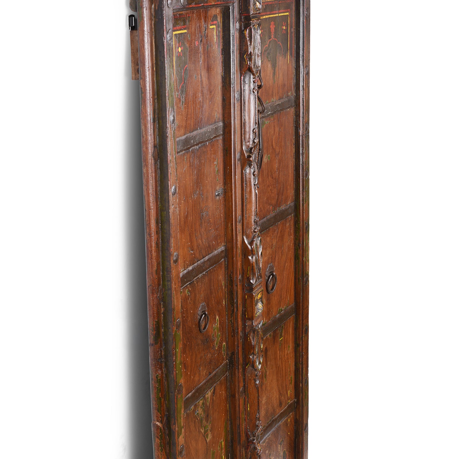 These beautifully patinaed 19th century Indian window shutters hail from the town of Bikaner in Northern Rajasthan, India. These shutters are solid rosewood, suggesting they would have come from a very wealthy haveli. Painted using natural mineral colours these window shutters would have been used internally in a majestic Indian haveli (merchants house). Much of the paintwork has faded leaving only patches and a beautiful dark wood grain beneath which we have waxed. The central column boasts intricate carving details. These shutters will make a totally unqiue piece of wall art.