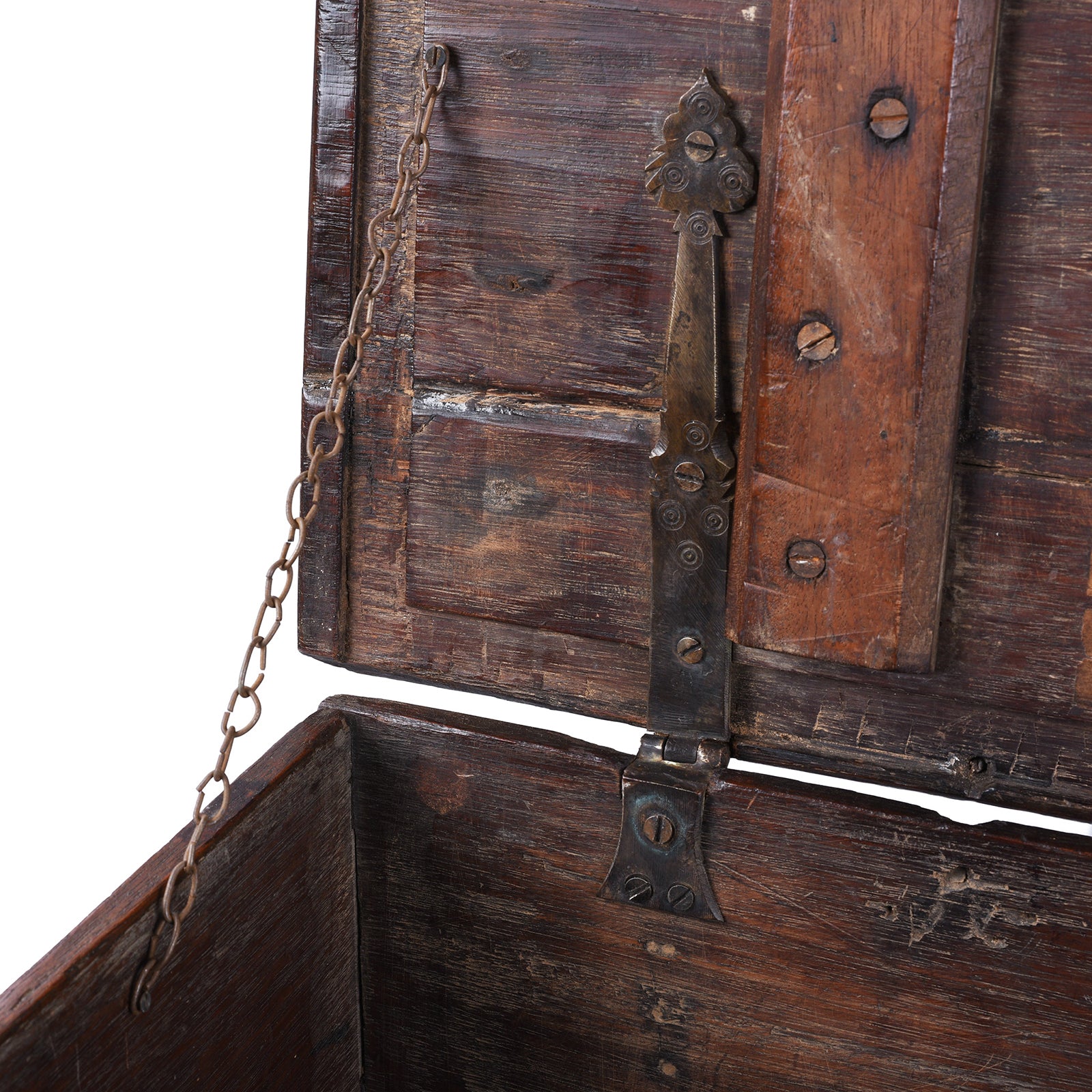 The hinged lid opens to reveal a generous interior for its size, complete with a small side compartment traditionally used for valuables or personal items. Original iron hinges, internal chain supports, and side carrying handles survive, showing honest wear consistent with age and use. Due to its compact proportions, this piece is best suited as decorative storage for jewellery, documents, textiles, or keepsakes.
