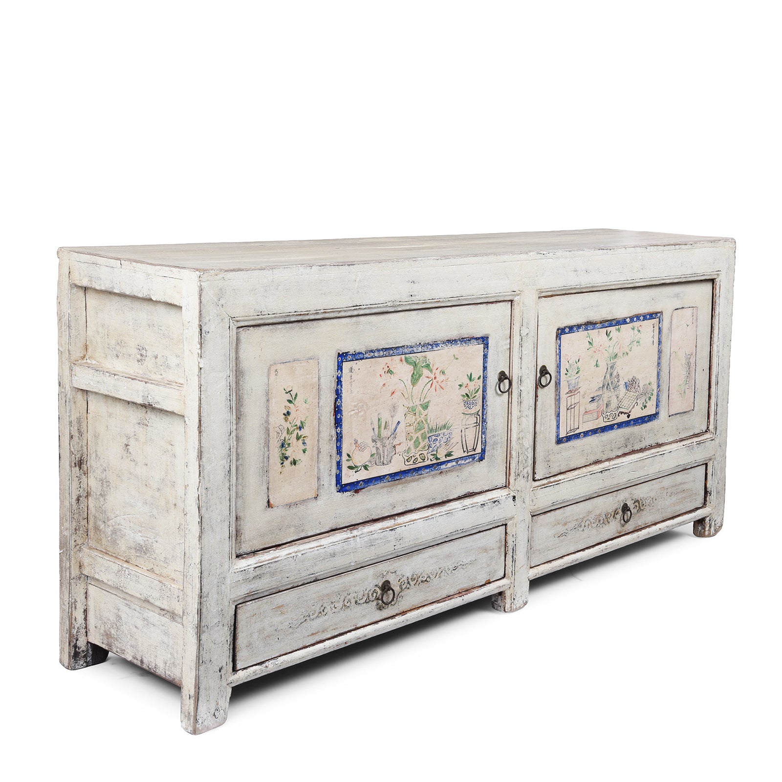 This charming painted sideboard originates from Inner Mongolia and dates to the circa 1920. Crafted from pine and retaining delicate traces of its original hand-painted decoration, it offers a rare glimpse into the nomadic material culture of northern China. Traditionally used for storing clothing, bedding, or grain, such cabinets often doubled as altar chests, forming the focal point of ancestor worship in the home.