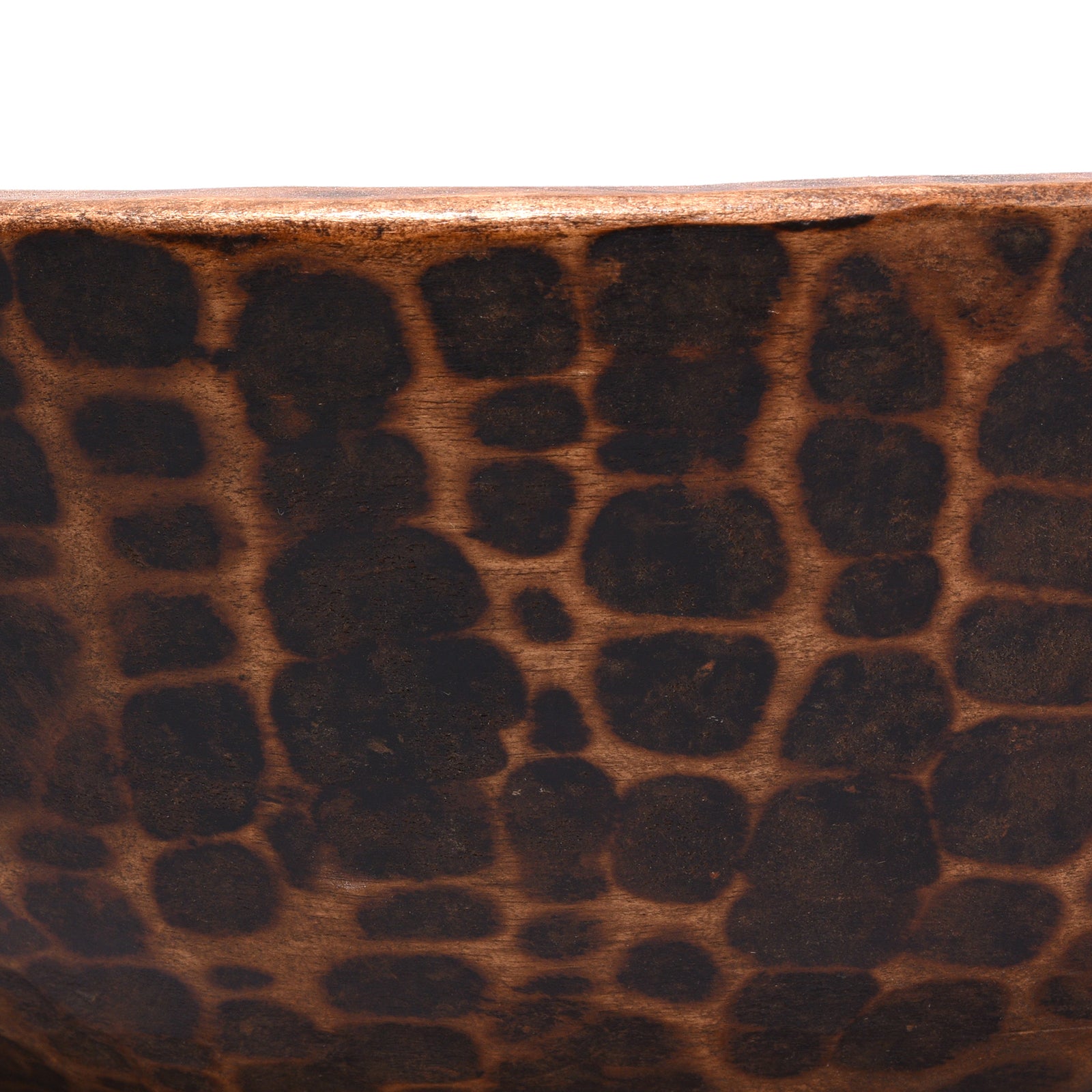 This antique carved teak bowl from Nepal is a fine example of traditional craftsmanship, once used for food preparation in a household setting. Hand-carved from a single block of wood, it has developed a warm patina over time that reflects both its age and long practical use.