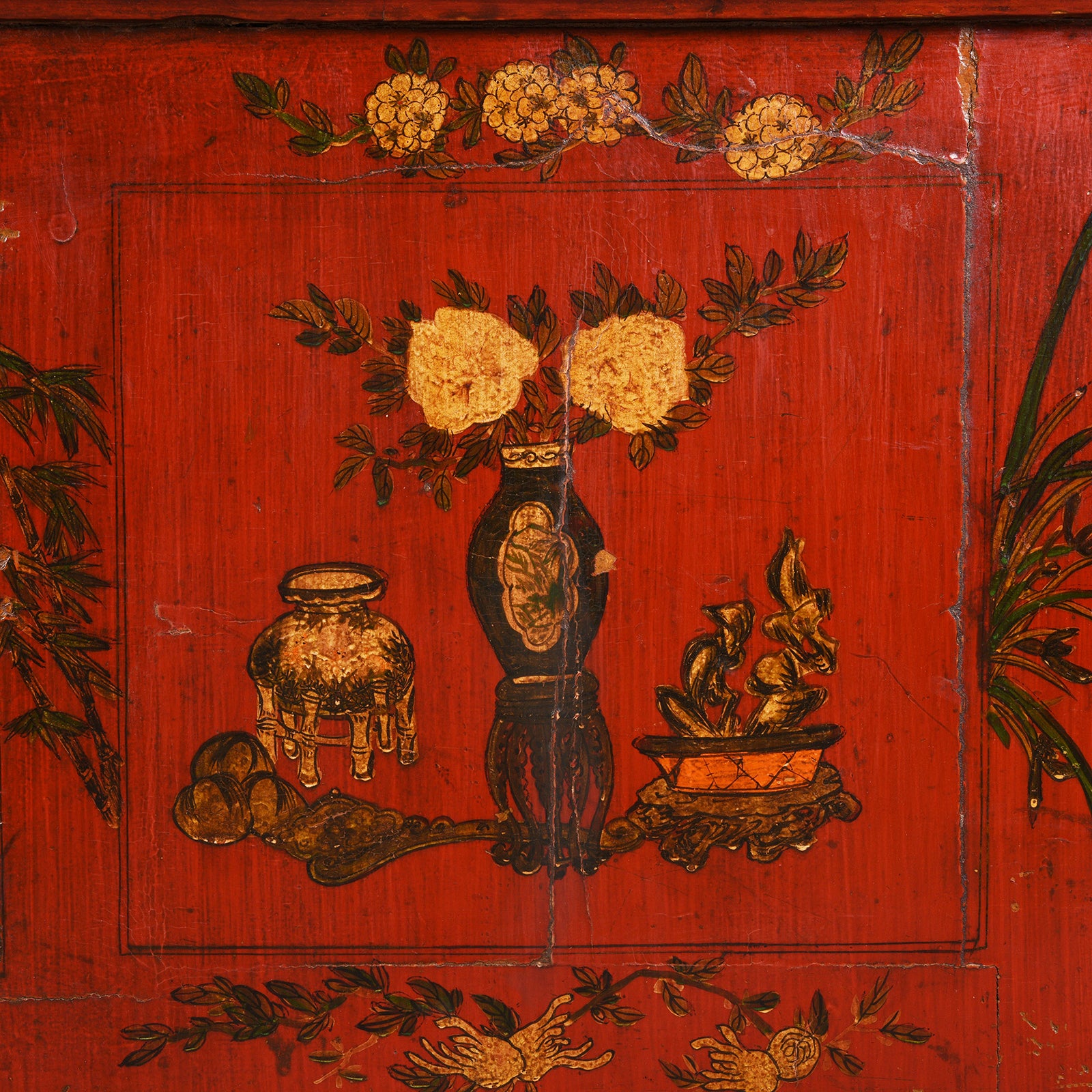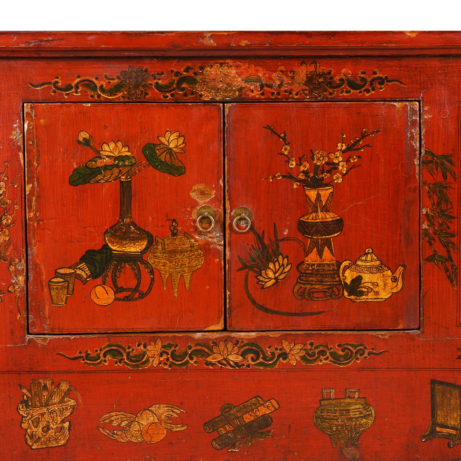 A painted antique Chinese sideboard from Qinghai province with very well preserved high quality original painting. This piece is primarily painted with domestic and 'wise' objects. Delicate floral bordering adds a further decorative touch.