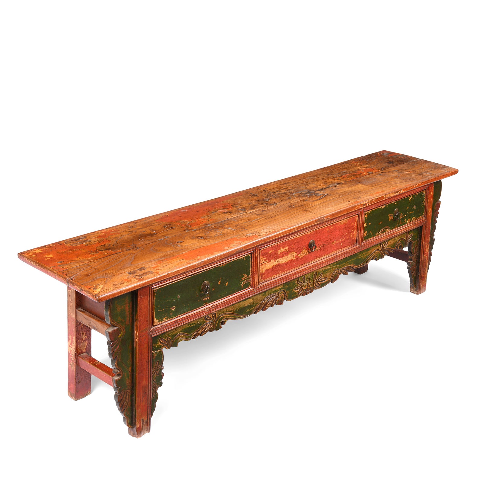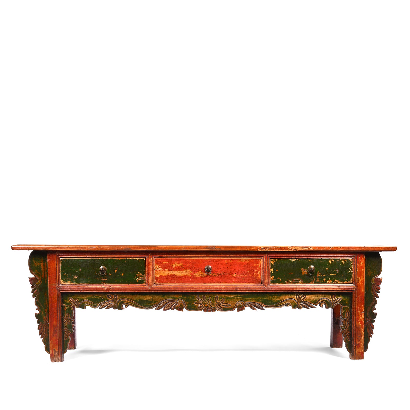 This green & red painted low 'Kang' table with 3 drawers is from Mongolia and dates to the late 19th century.
