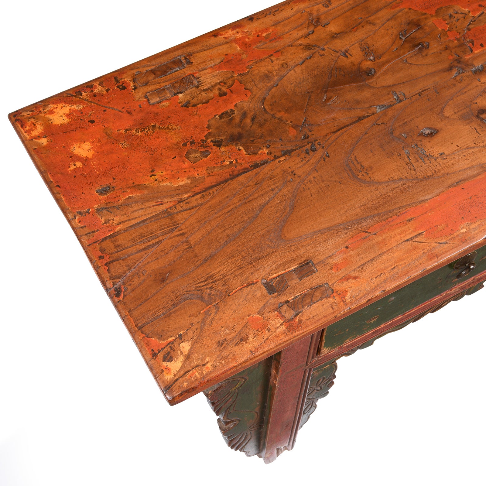 Top detail of worn lacquer on an antique Mongolian kang cabinet | Indigo Antiques