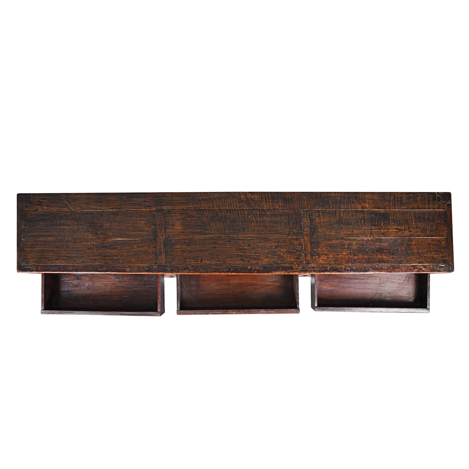 Crafted from locally sourced poplar and pine, sideboards like this served multiple functions in both nomadic and settled households - for storing clothing, bedding, and grain, or as altar cabinets for family ancestor worship. The vivid red lacquer frame, combined with the aged, crackled patina of the panels, gives this piece exceptional historical depth and poetic beauty.