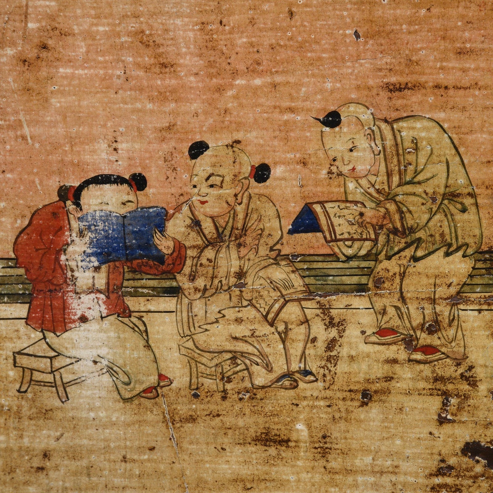 Painted Children Reading on an Antique Chinese Red Painted Sideboard From Qinghai Province - 19thC | Indigo Antiques