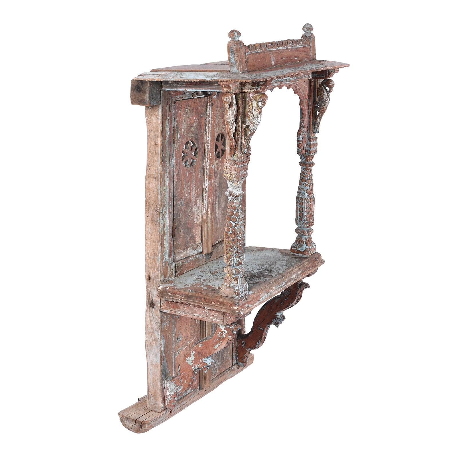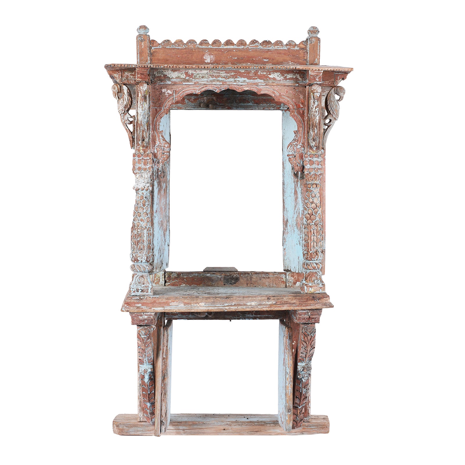 This wonderfully carved antique Indian shrine is from Gujarat and would have been set into a wall and used to house the family's favourite deity in a Hindu or Jain household. Dating from the 19th century, the central doors can be opened or closed. The traditional Mughal mihrab arch is flanked by two pillars surmounted by parrots. This house temple still has many layers of its original and earlier paint.