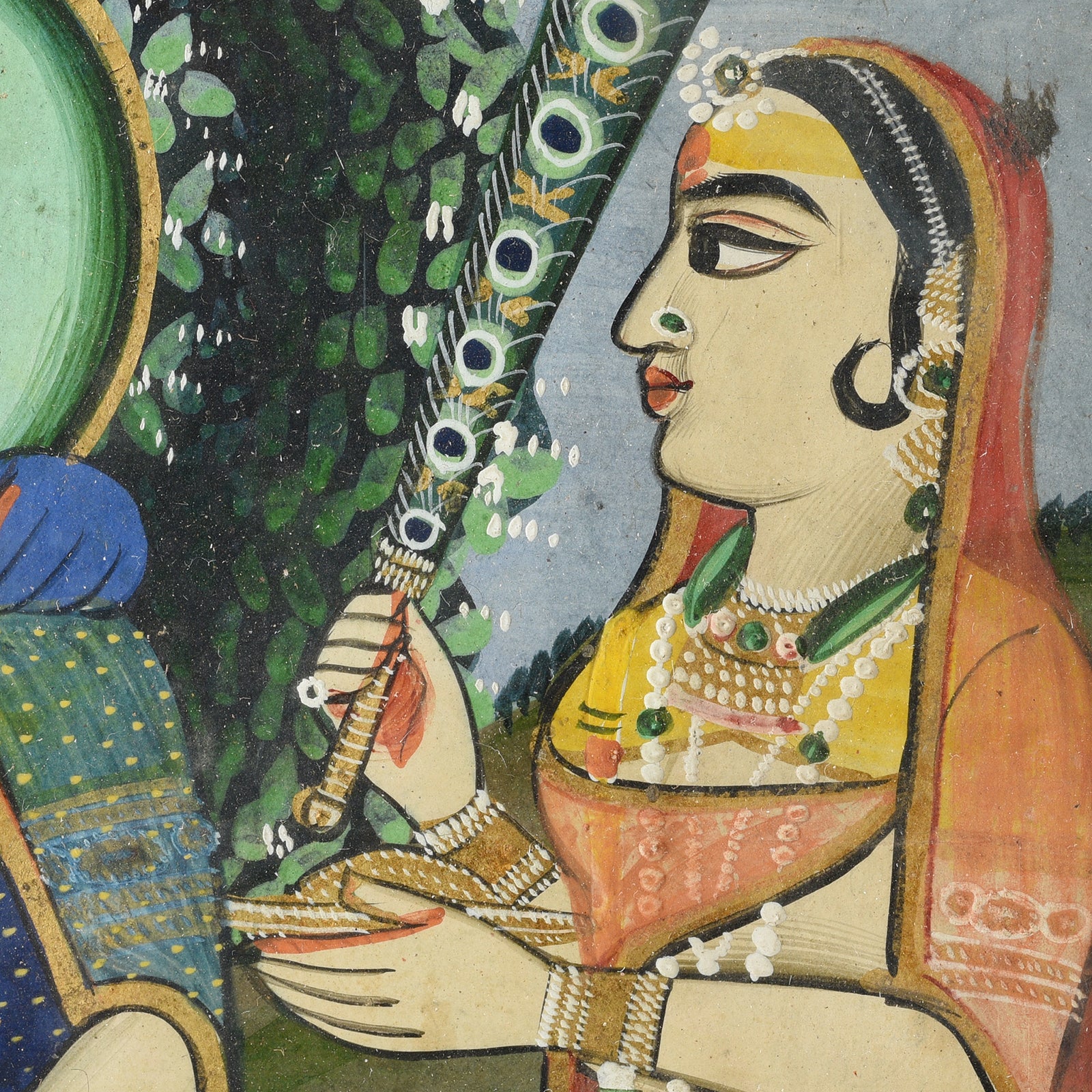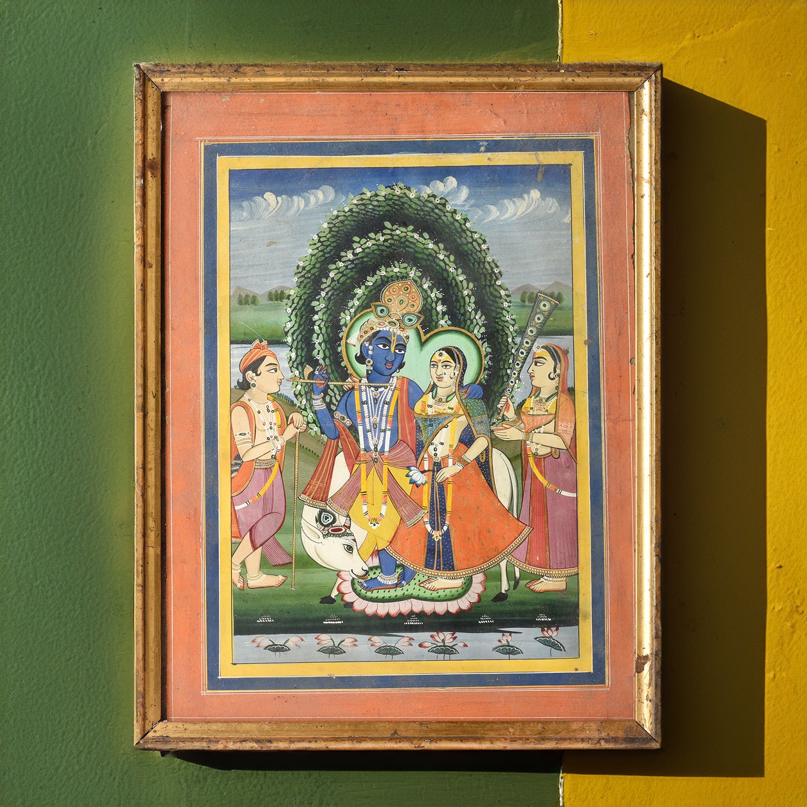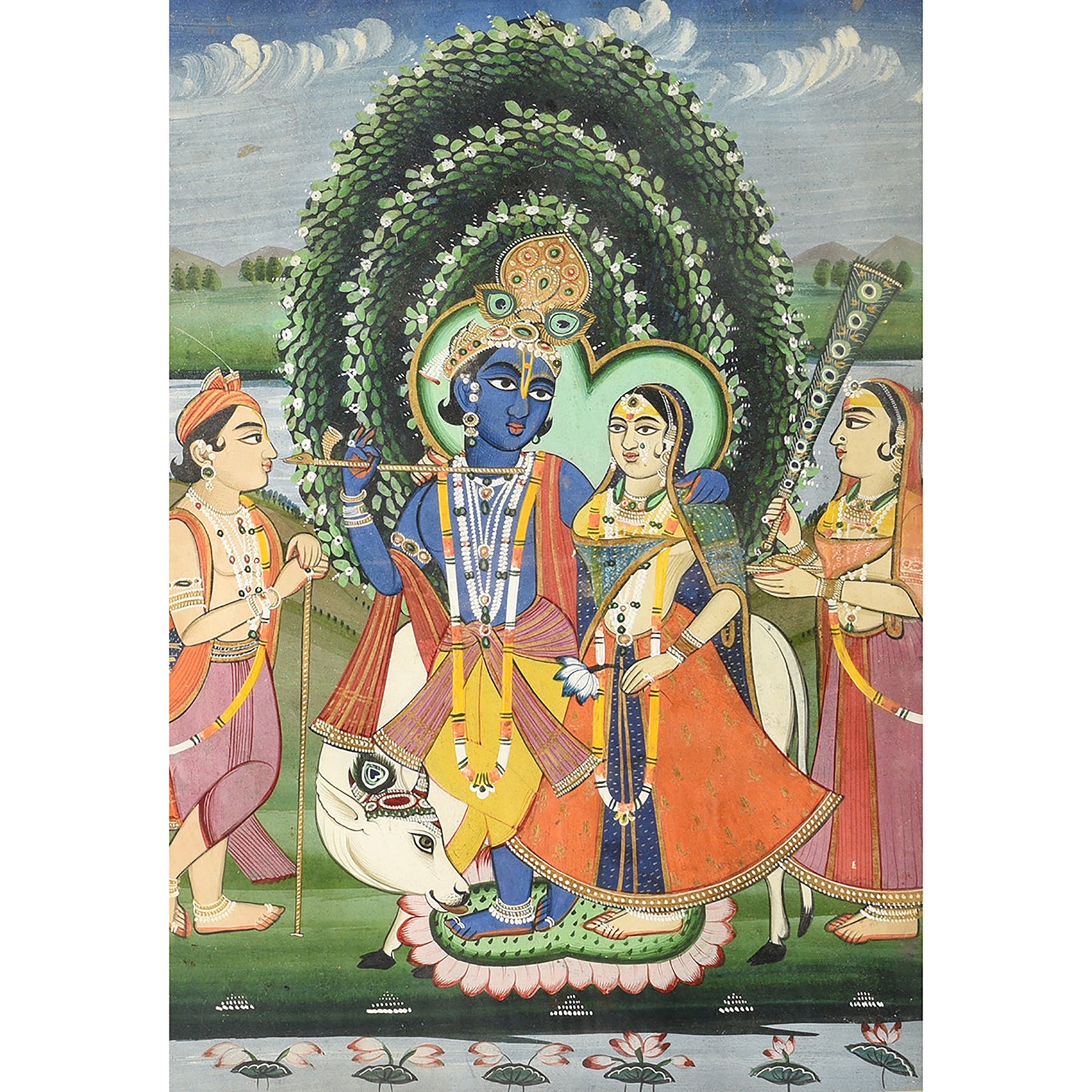 This old Indian watercolour depicts Krishna & Radha standing on a lotus leaf flanked by The Gopis and their cow. The painting is excellent condition and in an old gilt frame. The style is of the Jaipur School of painting.