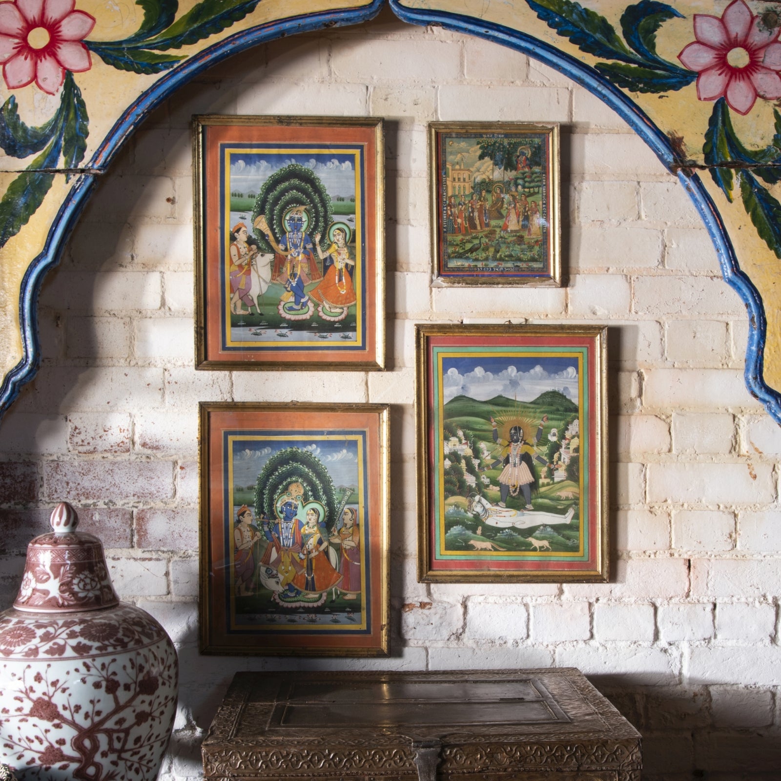Krishna & Radha's story of eternal love is a deeply popular theme in Indian paintings. Often called 'Radha Krishna', it is a romantic tale depicting the beauty of romantic and physical love. Radha was already married and they engaged in a passionate intermarital affair transcending traditional mortal relationships and morality. The subject has become more secular than religious and symbolises the union between the human soul and the divine.