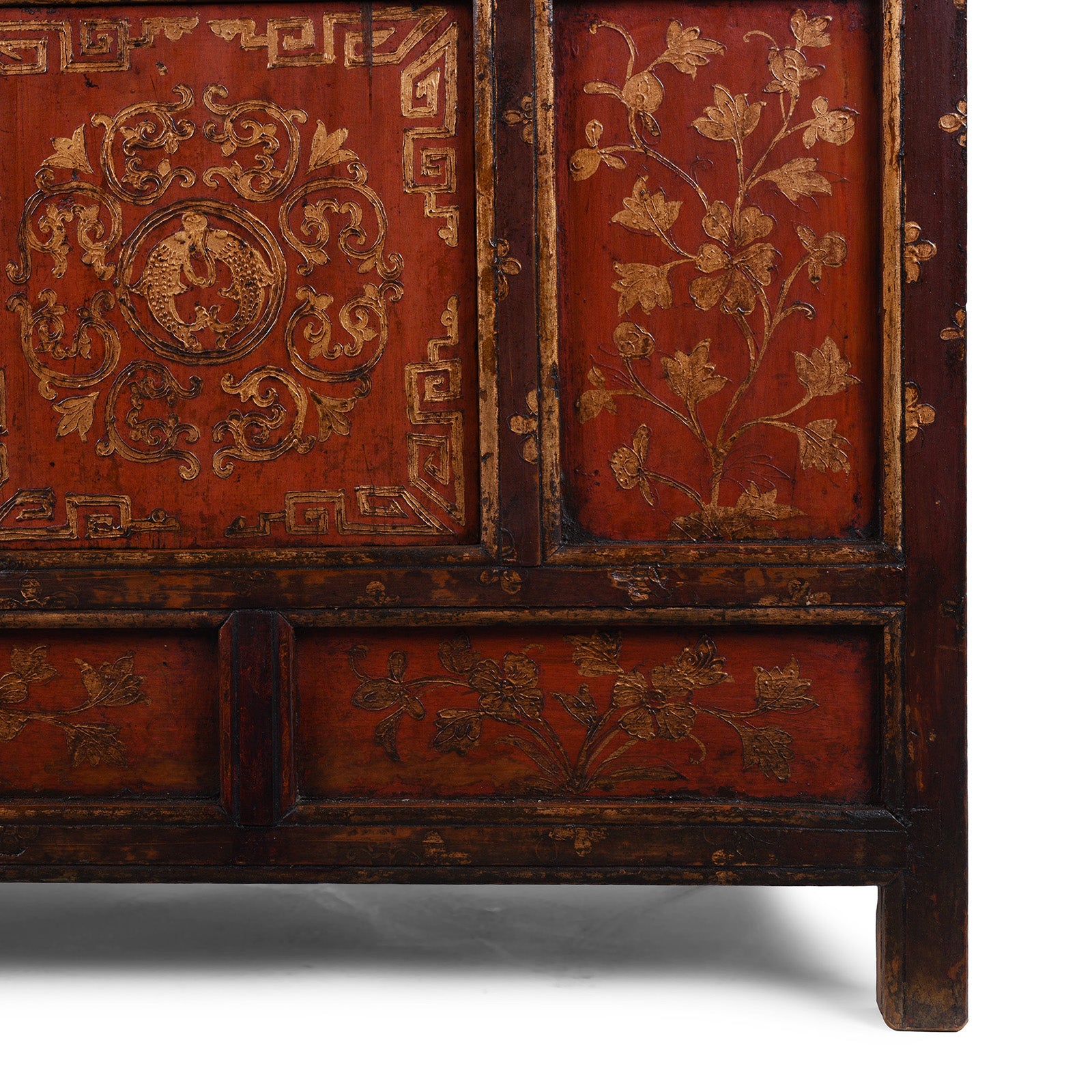 This atmospheric Tibetan altar cabinet, dating from the 19th century, is a superb example of Central Tibetan painted furniture created for household Buddhist practice. Its deep red ground is enriched with luminous gold decoration, much of it executed in kyungbur — the raised gesso technique used in thangka art to give sacred motifs a subtle sculptural relief. The colour palette itself carries strong symbolic meaning: red represents vitality, protection, and the life-force, while gold signifies enlightenment, merit, and auspicious blessing.