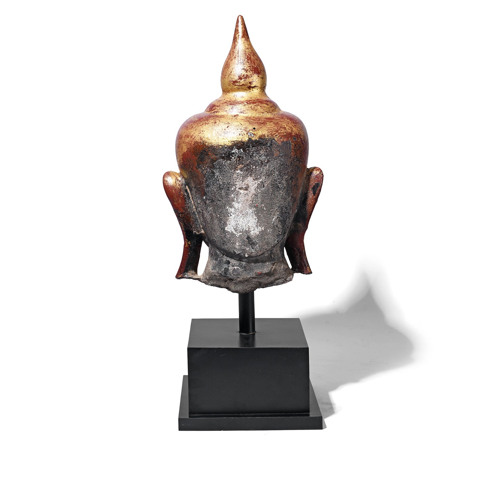 This serene Shakyamuni Buddha head is Burmese and sculpted from solid stone & lacquered with a dark reddish brown lacquer. Mounted on a simple black lacquered stand, this Buddha head dates to the 17th or early 18th century and crafted in the earlier Ava style.