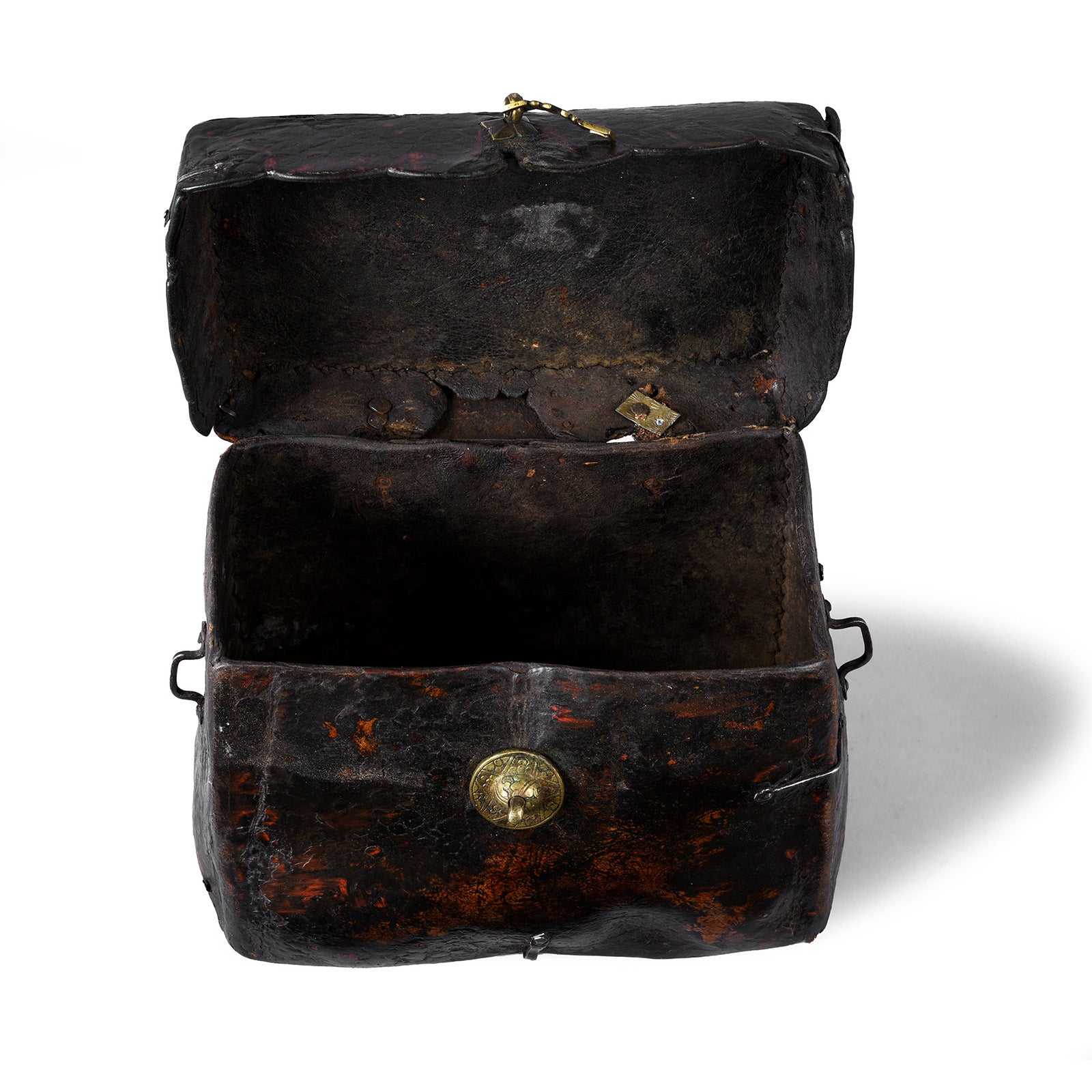 The scalloped lid edge, original brass script-form clasp and iron side loops reflect traditional Tibetan leatherworking practices. The unlined interior, stitched seams and textured patina underline its early construction, while its portable size points to its use as a personal travelling box carried on horseback.