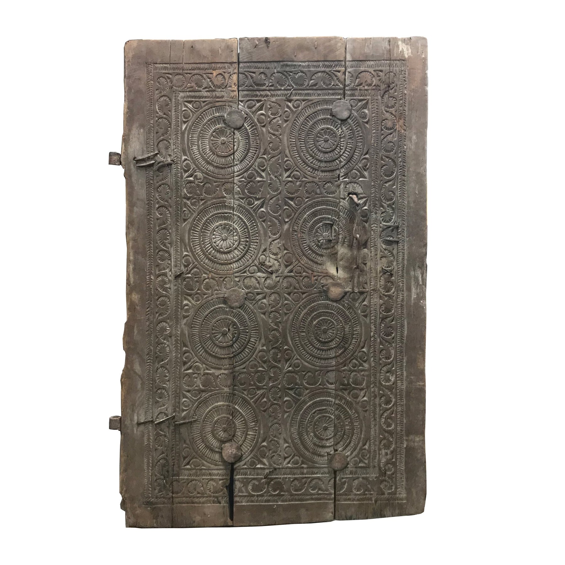 This teak window shutter from Maharashtra features intricately carved circular tribal art.