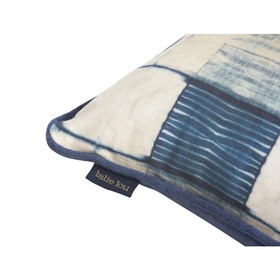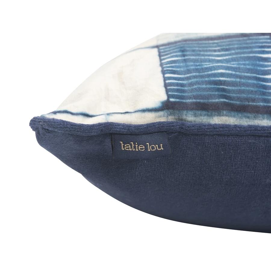 Indigo Itajime Cross Cushion. This beautiful design uses the 'Itajime' Shibori technique to create the cross repeat which is then digitally printed onto gorgeous soft pile velvet. Cushion front fabric is soft pile poly velvet Luxurious indigo velvet backing and piping Includes extra stuffed 100% duck feather-filled cushion pad Concealed zip fastening Dry clean only