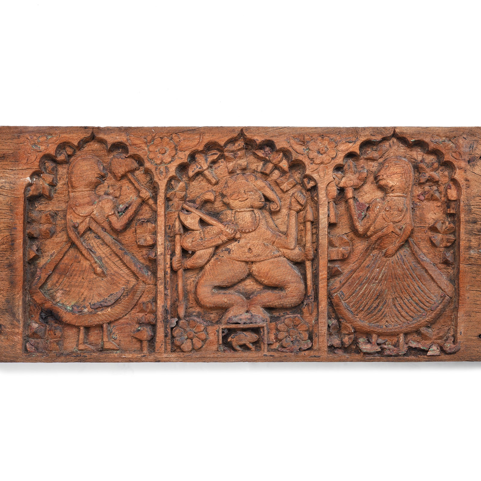 This particular panel is made from teak wood and dates to the 18th century. Ganesh, the elephant headed Hindu god can be seen accompanied by his mouse vahana (vehicle) flanked by two female attendants. The piece has been painted with ochre, resulting in a stunning rust red color. This unique item would make a striking addition to any wall, especially when paired with accent lighting or displayed above a fireplace.