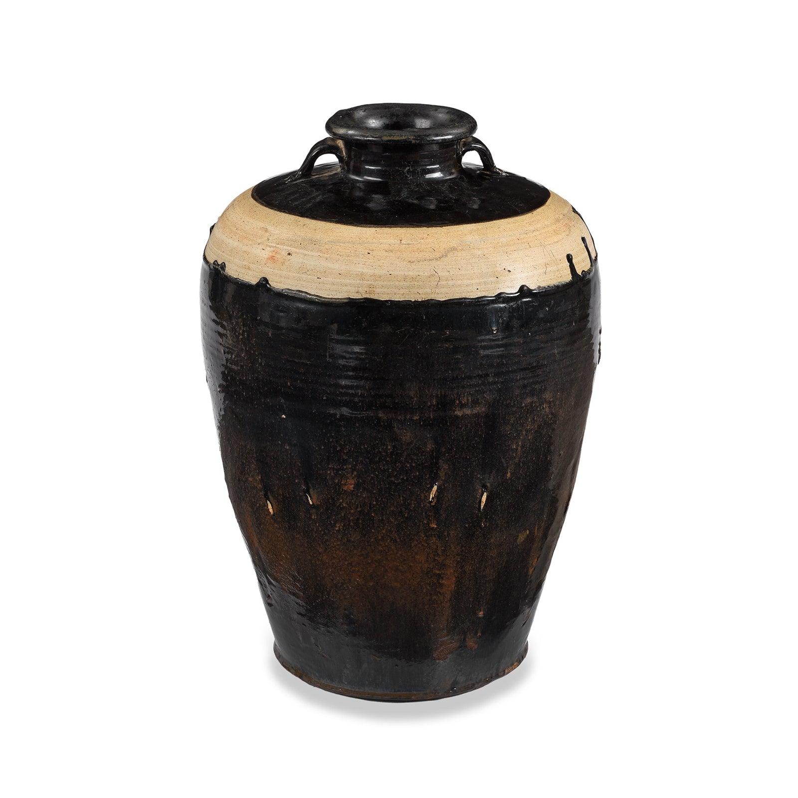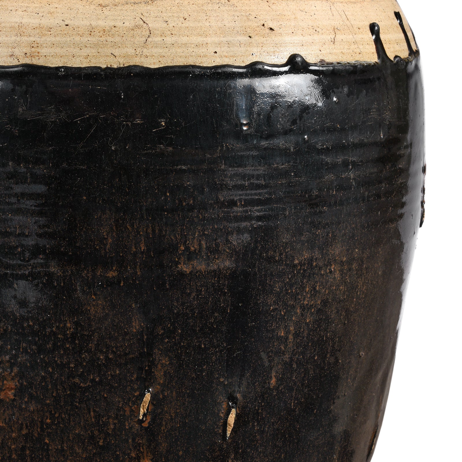 This black glazed stoneware storage jar from 19th century Hebei province in China would have been used for the storage of liquids such as wine, vinegar, and oils. This large jar has a black dribble glaze with iridescent hints of a brown overglaze and would look best displayed as a decorative jar.