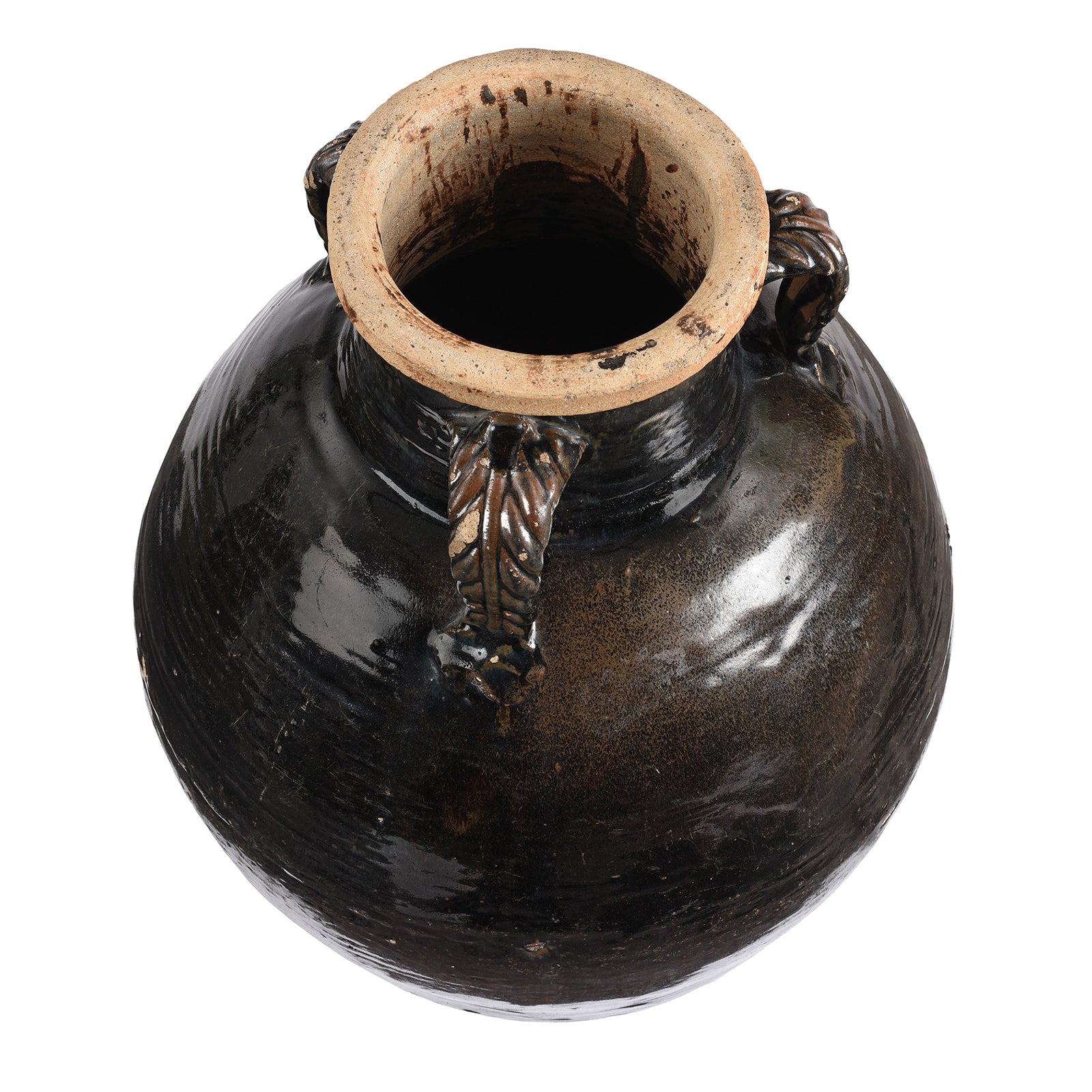 This black-glazed Chinese stoneware wine jar from the 19th century in Hebei, China, was commonly used for storing liquids such as wine, vinegar, and oils. Its impressive size and distinctive black dribble glaze, with hints of iridescent brown overglaze, make it a striking decorative piece.