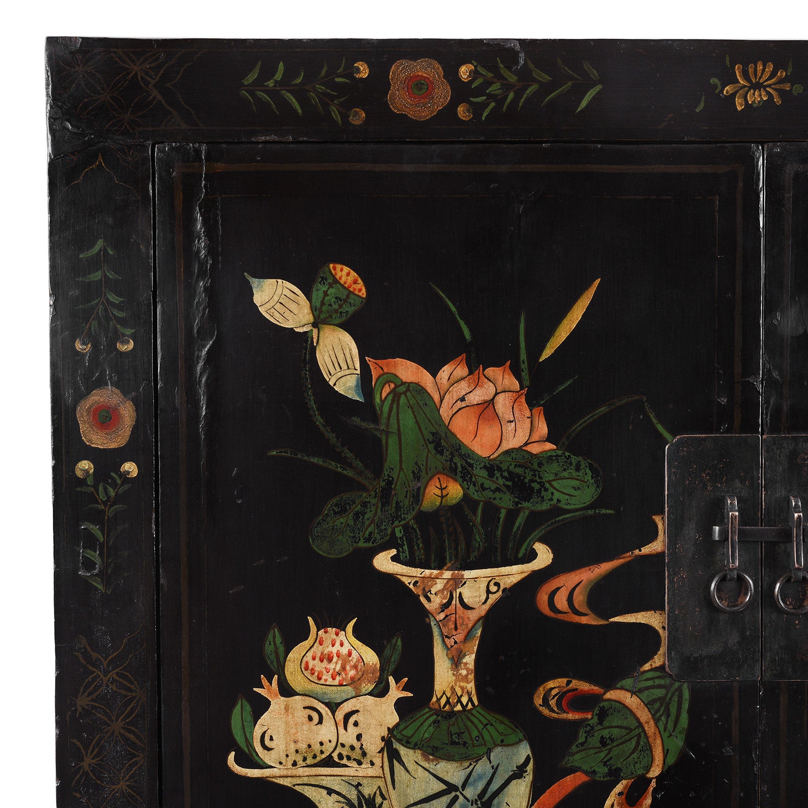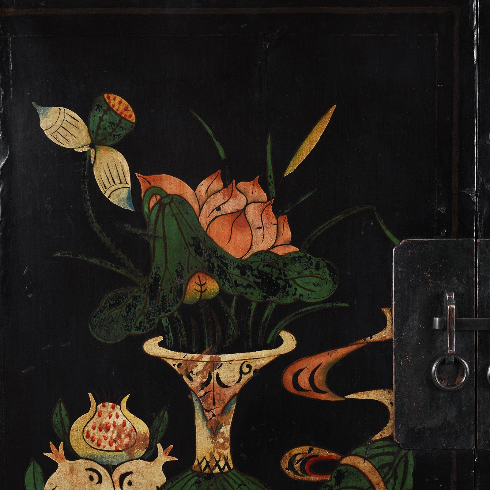 The interior reveals a practical and thoughtfully arranged storage configuration with a recessed central compartment, two shelves, and a pair of fitted drawers to the upper section. Traces of original floral-decorated paper lining remain intact on the interior panels, offering rare and evocative evidence of its original decorative scheme. Both functional and painterly, this cabinet stands as a refined example of northern Chinese lacquer furniture rooted in literati culture.