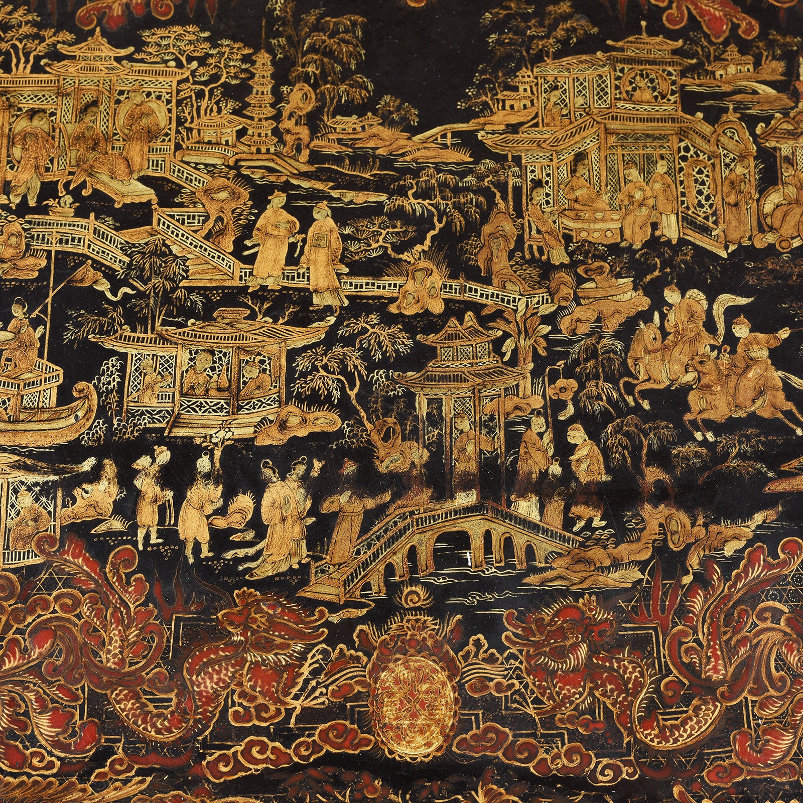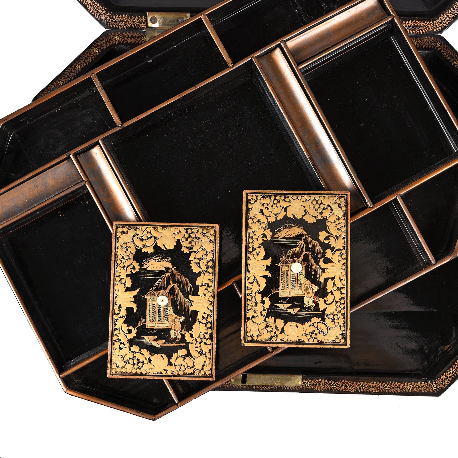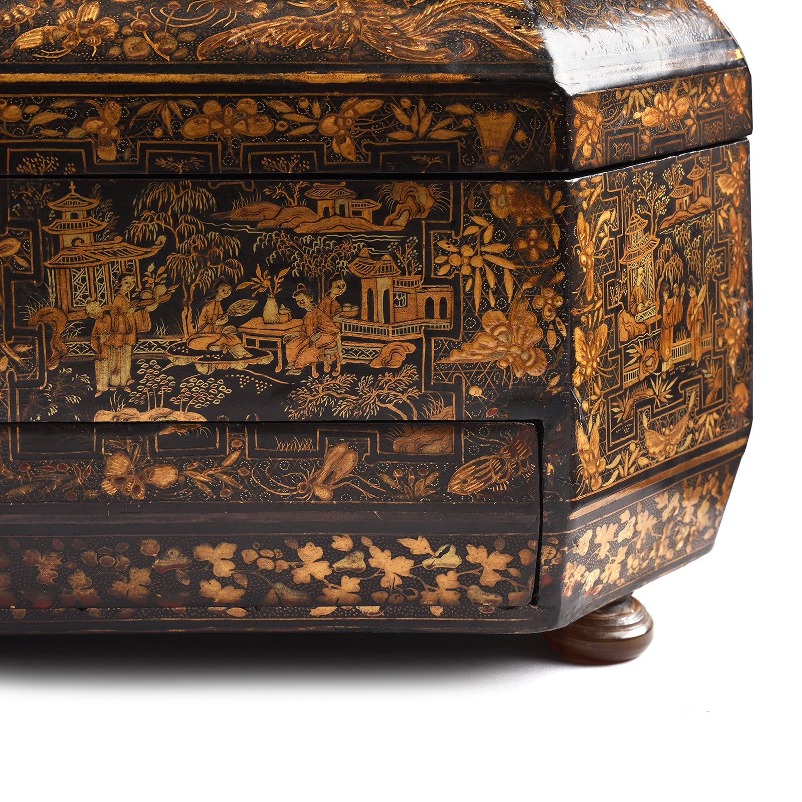 Detail From Antique Black Lacquer Chinoiserie Sewing Box - Early 19th Century | Indigo Antiques