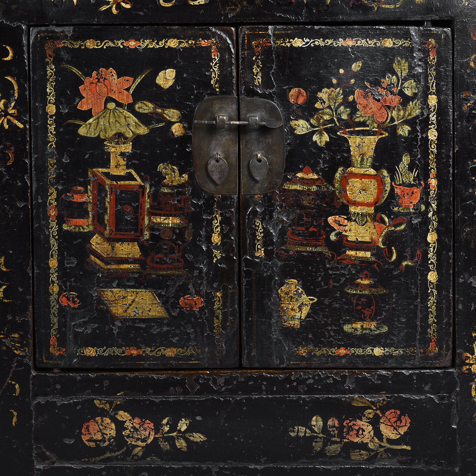This excellent example of a Qing dynasty (1644-1912) black lacquer Chinese sideboard features beautiful paintings of scholarly objects and floral arrangements. The lacquer and painting are original dating from the 18th century, early Qing dynasty - The beautiful thick brass hardware is original to the piece.