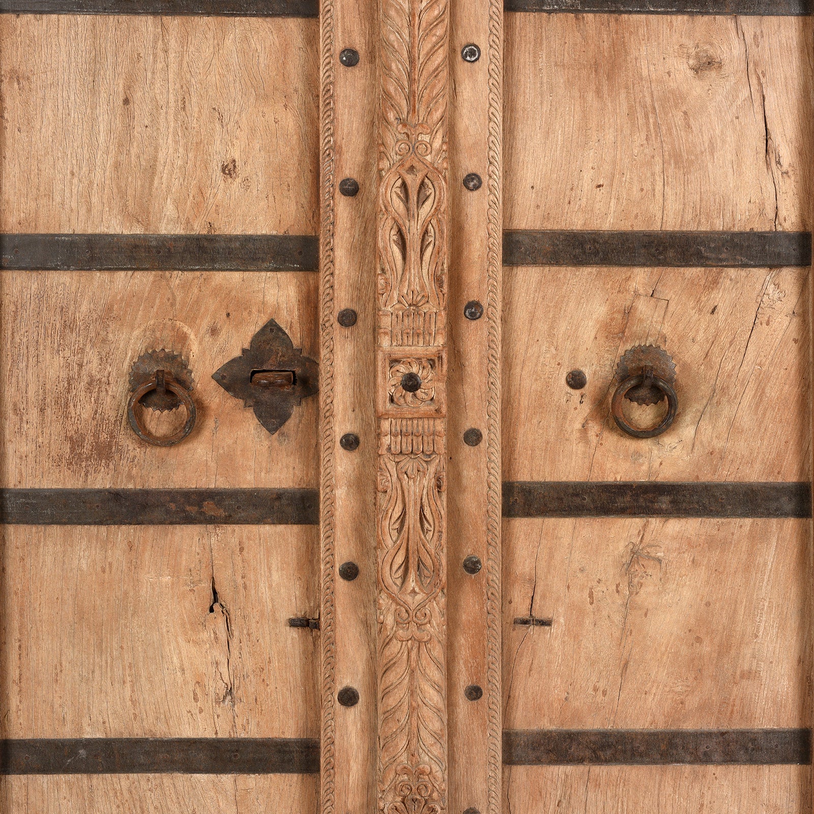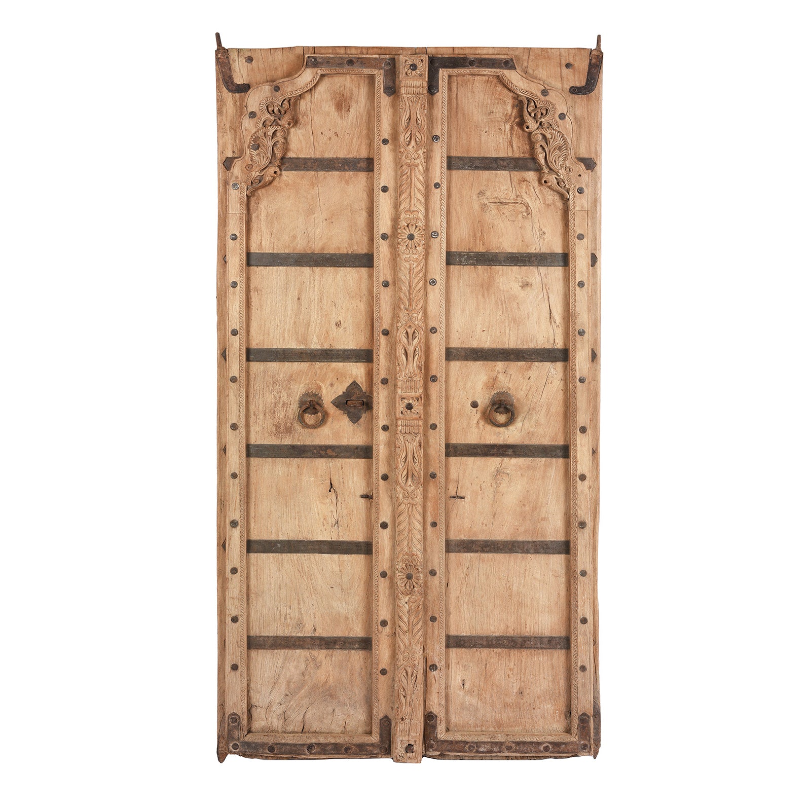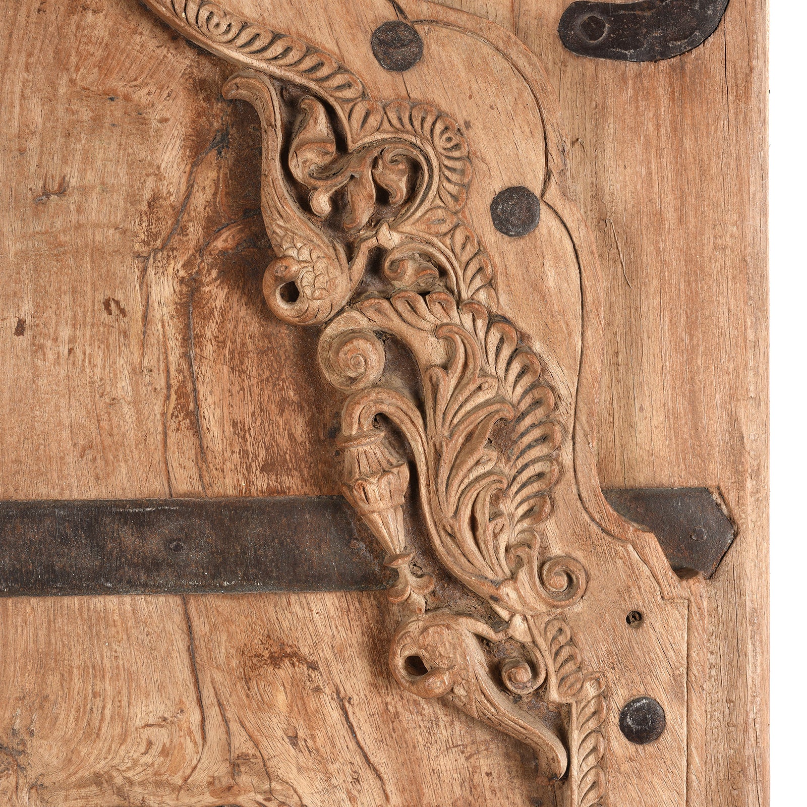These beautifully carved antique Indian doors from Bikaner would once have been covered in extravagant painting and after many years in the Thar desert have been sun-bleached. The top corners of this door have beautiful detailing with intricately carved peacocks. Doors like this are perfect for a wall mounting and we've fitted it with strong hangers.