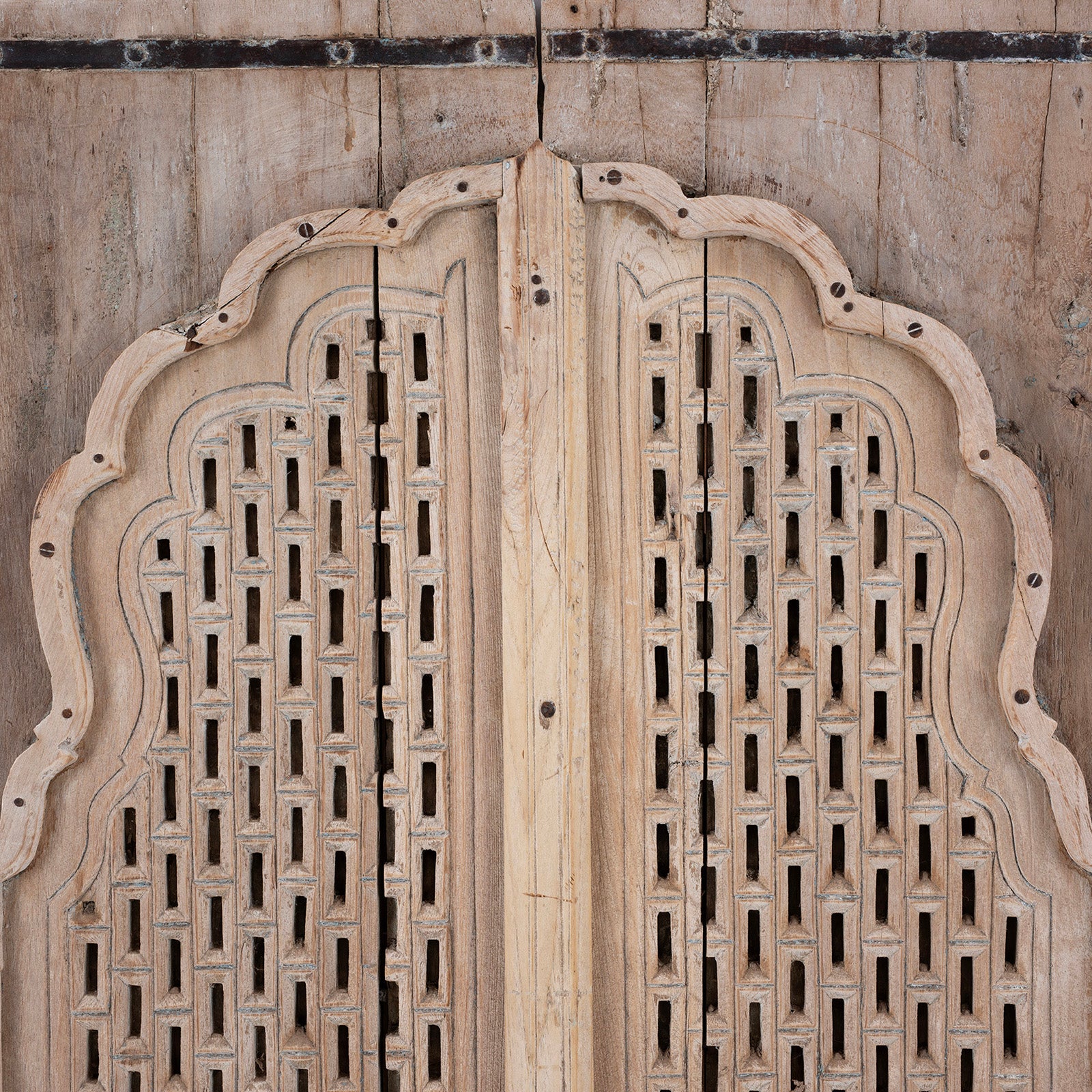 This beautifully limed teak window shutter from Hyderabad dates to the 19th century and showcases the refined craftsmanship for which the Deccan region is renowned. The pierced panel is framed by an elegant Mughal-inspired arch, a design feature that reflects the strong architectural influence of the Mughal courts across southern India. Its layered contours and graceful curves soften the geometric latticework, giving the piece both delicacy and presence.