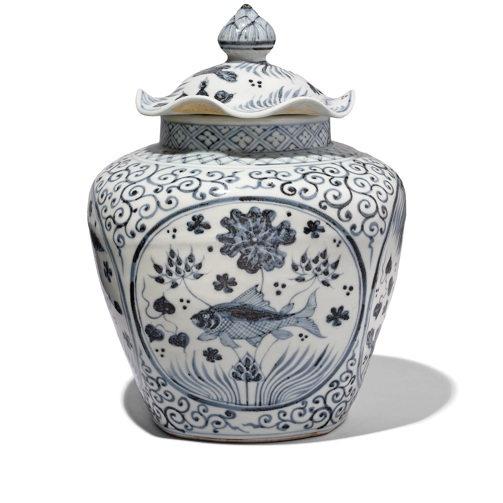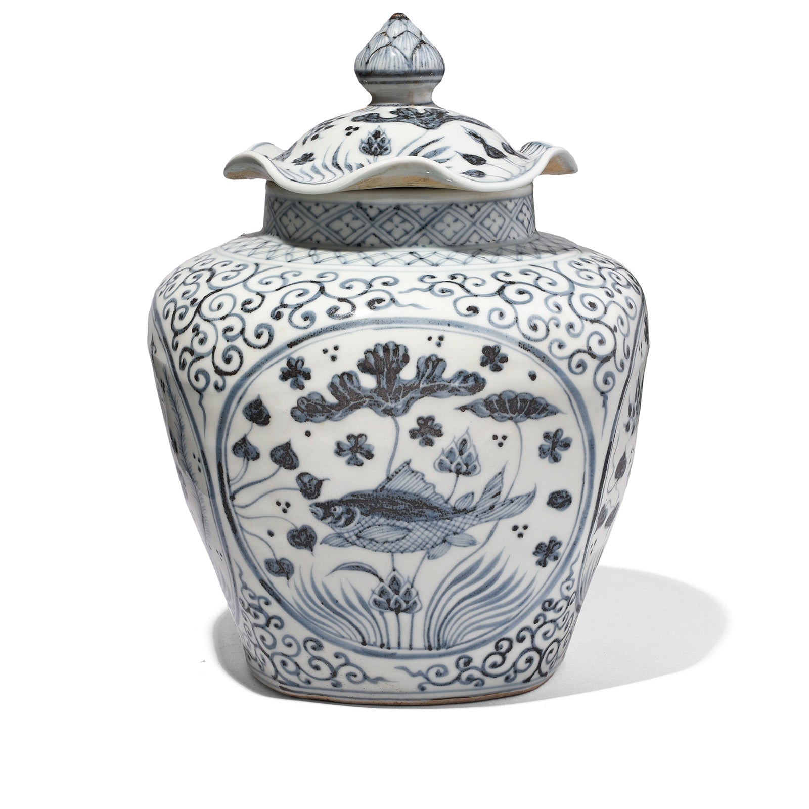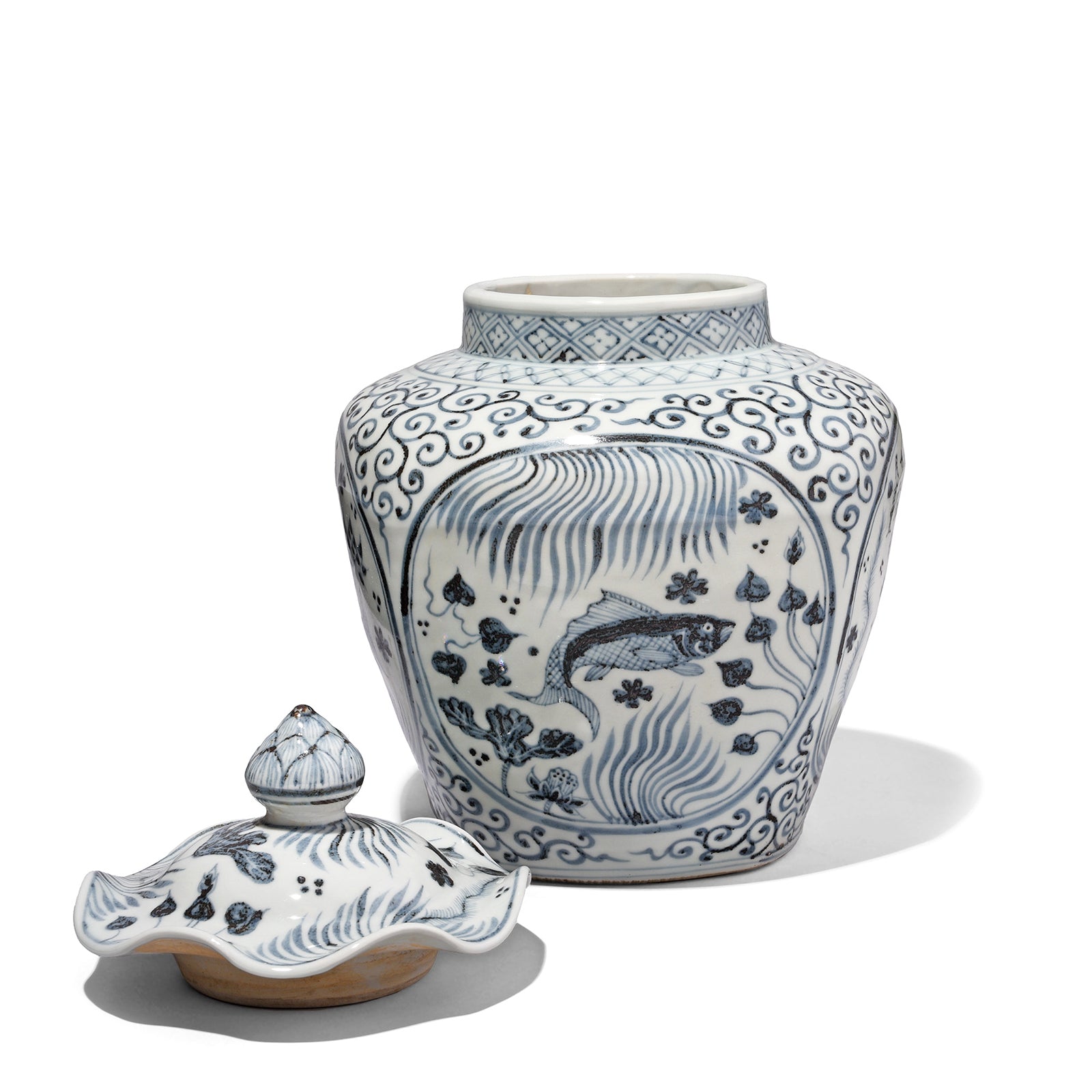 Hongwu Blue & White Porcelain Frilled Ginger Jar - Fish