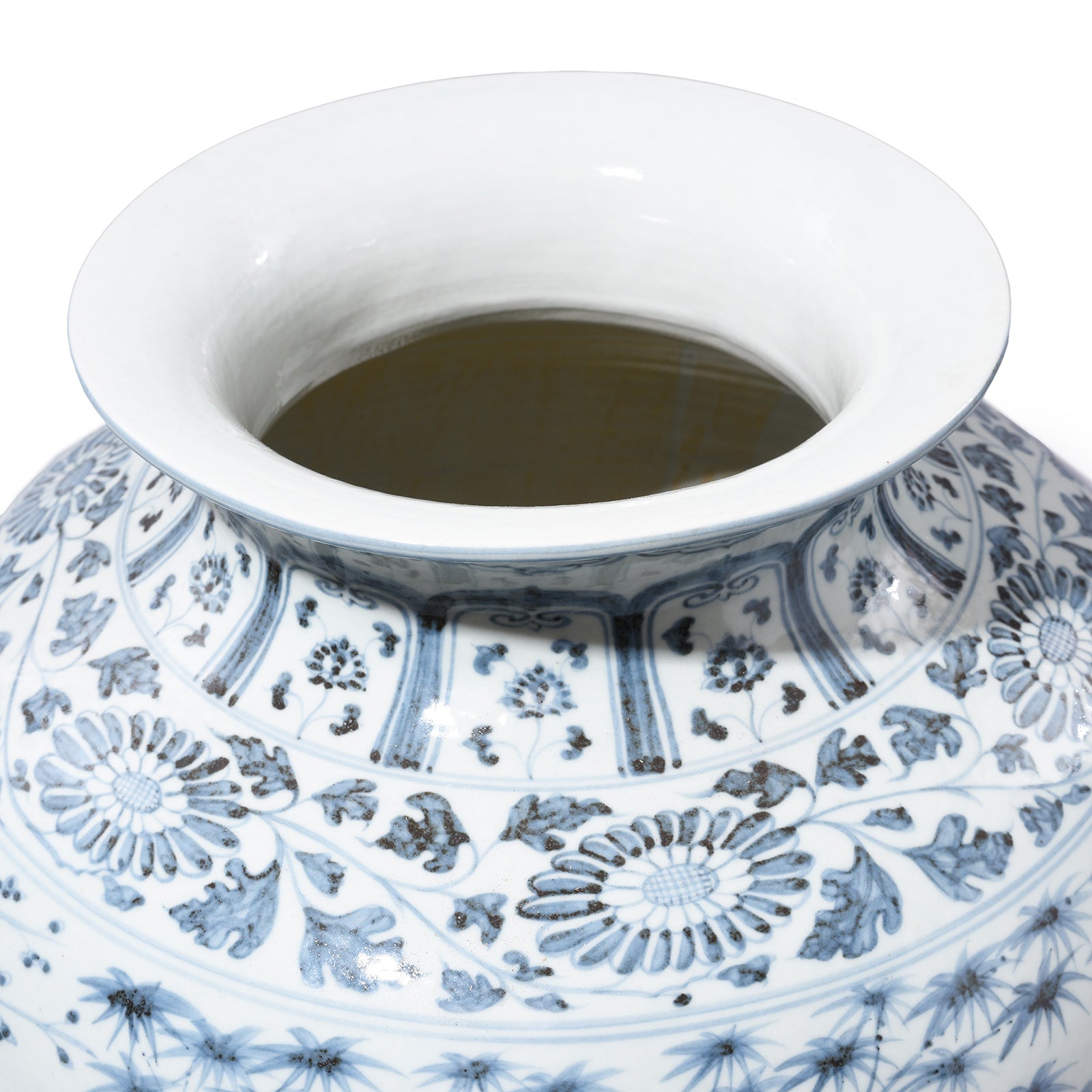 This reproduction Chinese blue & white temple jar is hand painted by skilled artists using traditional techniques learned from their families and passed down through generations.