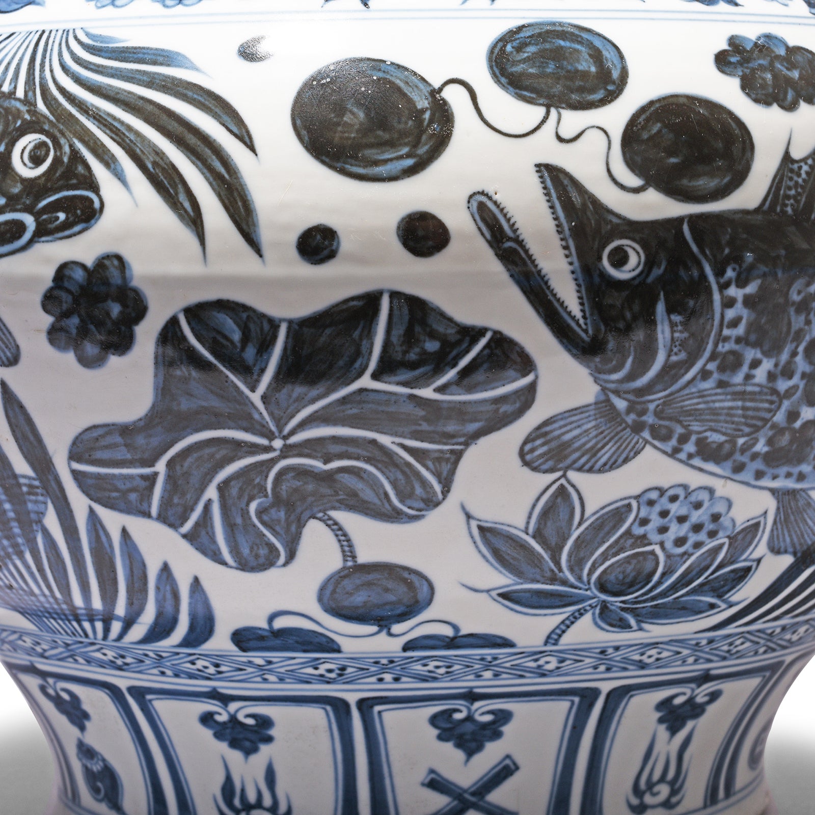 This design is inspired by an important 14th century, Yuan style fish and algae jar found in The Osaka Municipal Museum of Oriental Ceramics, Japan. Fish and algae patterns became important in the porcelain development of the Ming dynasty.