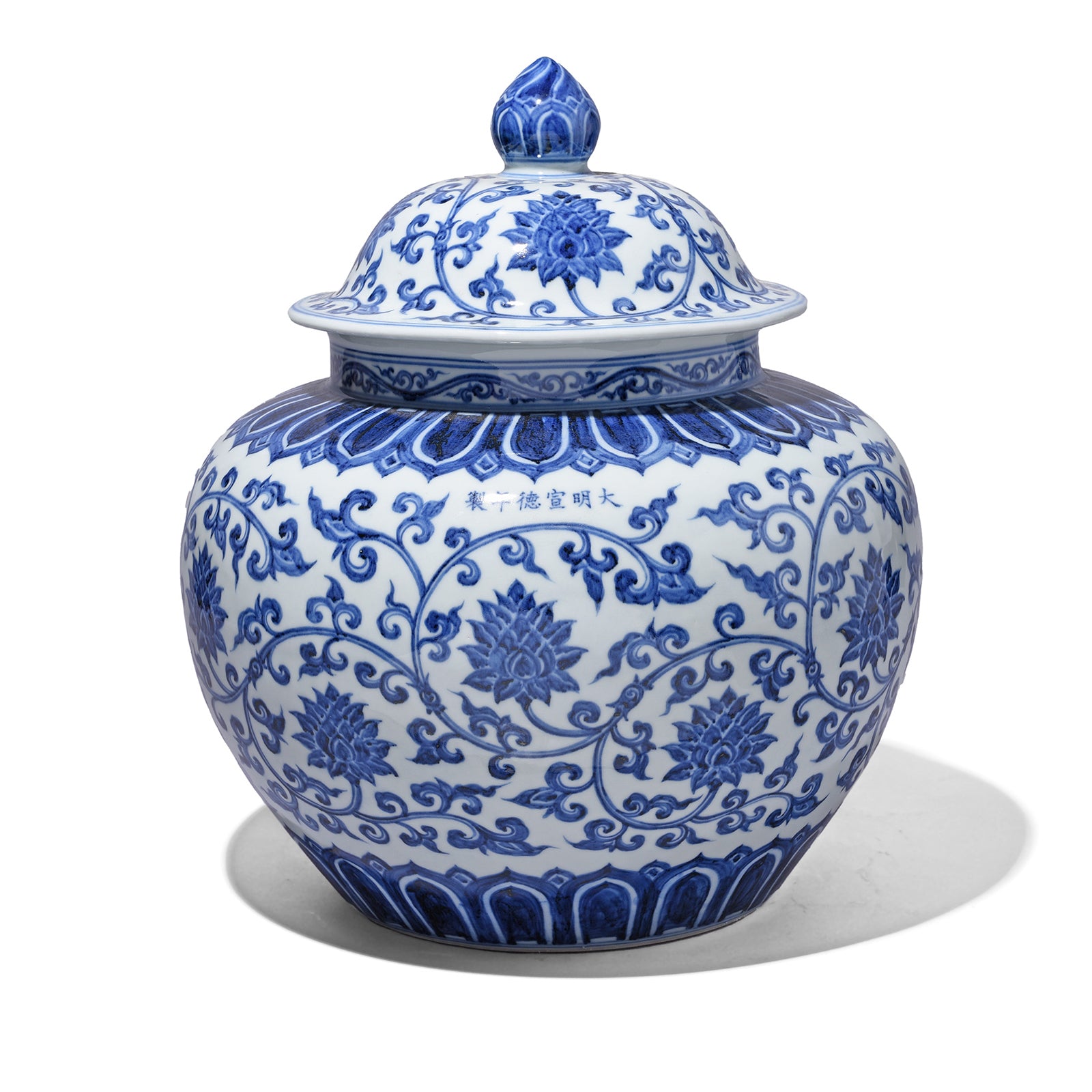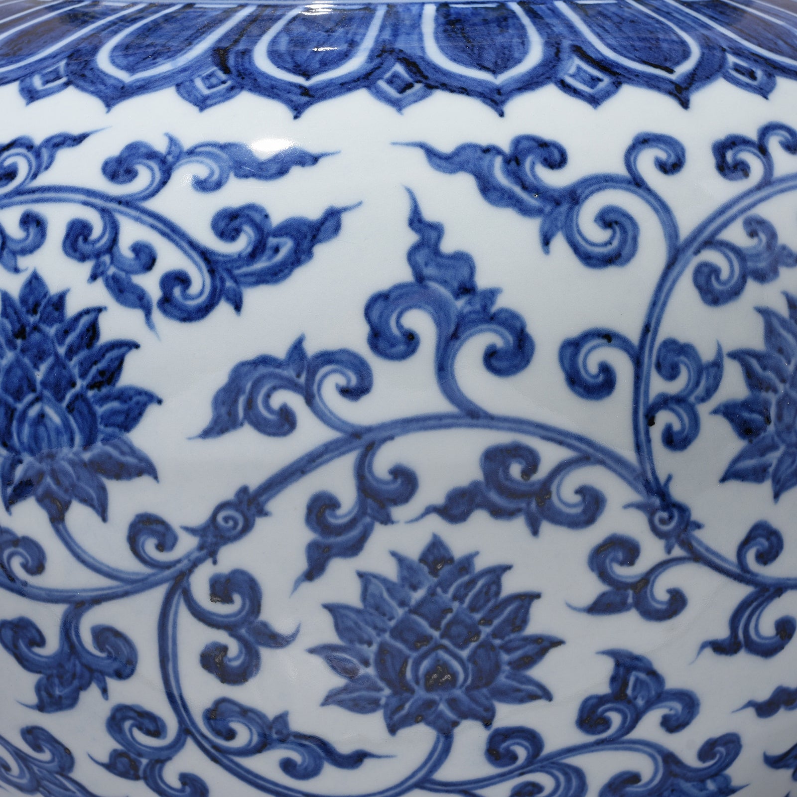 This reproduction Chinese porcelain lidded urn is decorated with a delicate trailing lotus design hand painted in a dazzling blue glaze. This beautifully decorative jar is an iconic addition to any home.