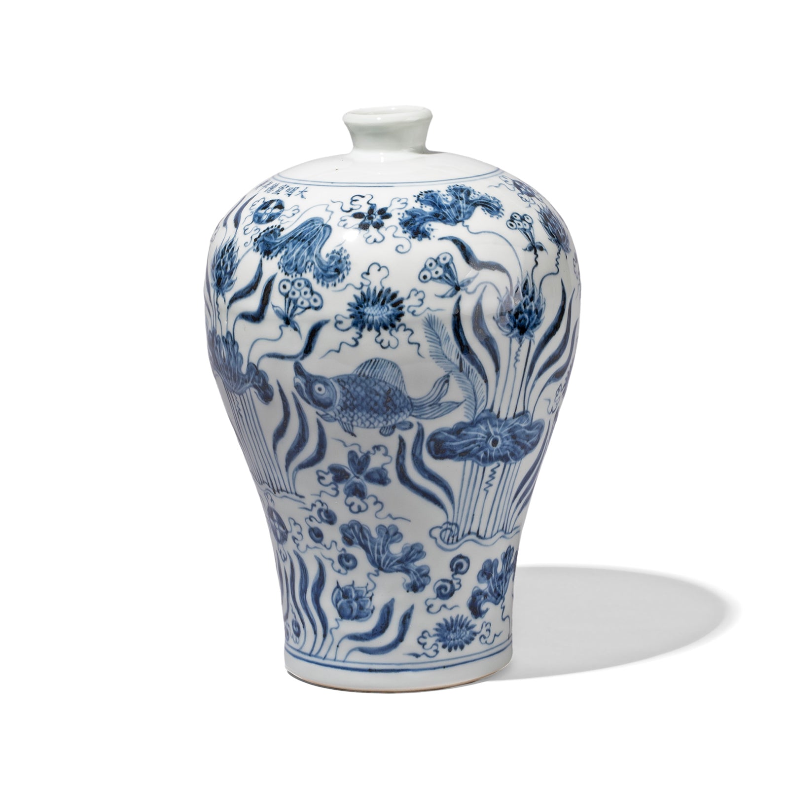 This fabulous reproduction Chinese blue & white porcelain meiping vase is decorated with Xuande fish, lotus & aquatic plants patterns. The design is inspired by Xuande period (1399 - 1435) vases and bowls.