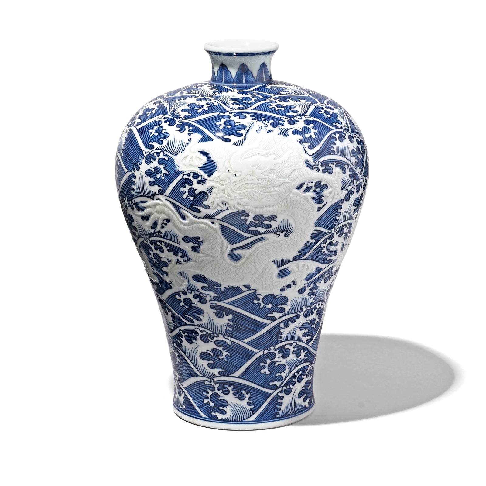 This reproduction Chinese porcelain meiping vase is skillfully decorated in inverted blue & white glaze. The painting depicts five claw white dragons on a background of waves. Although the dragon was claimed as the symbol of the emperor during the Han dynasty (206 BC - 22 AD) it wasn't until the Ming dynasty (1368-1644) that the five claw dragon became the specific symbol of imperial might. It was then that the use of the five claw dragon outside of the imperial court became treasonous