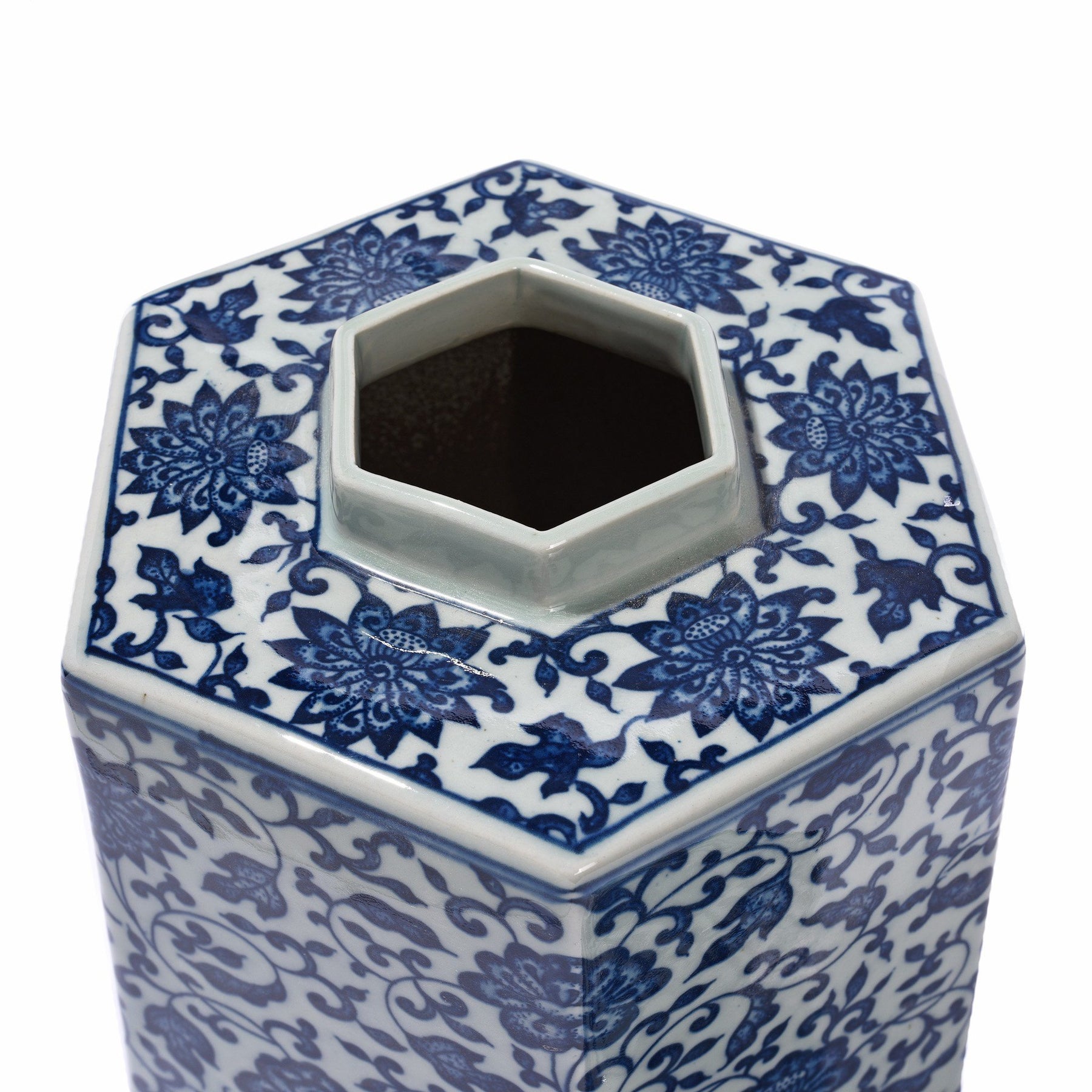 Blue & White Porcelain Hexagonal Tea Caddy - Peony Design