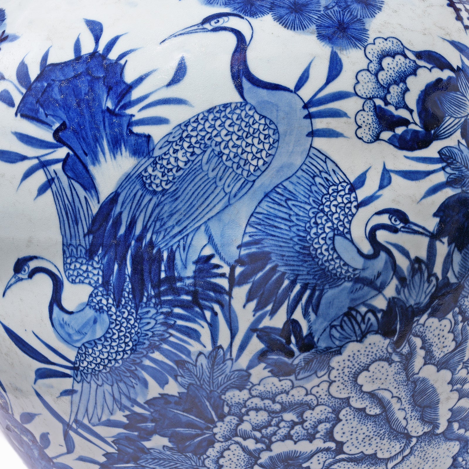 This Chinese blue & white temple jar has a beautifully intricate crane design. It is hand painted by skilled artists using traditional techniques learnt from their family passed down through generations.