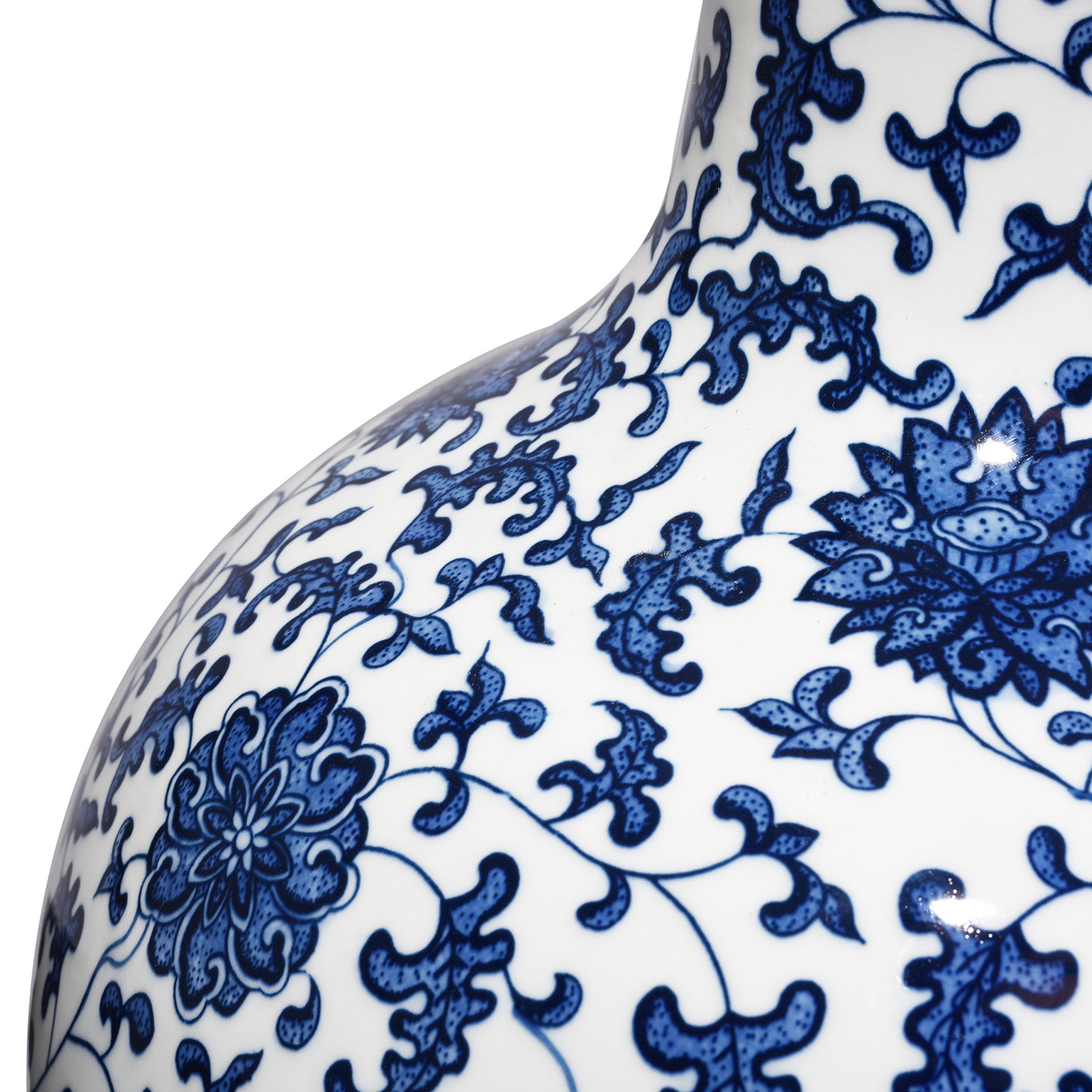 This grand and striking Chinese porcelain tianqiuping bottle vase is decorated in blue & white glaze with a trailing chrysanthemum design. A reproduction of a traditional Qianglong period (1711-1799) design. The chrysanthemum flower is a symbol of longevity and long life. Chinese people even drank chrysanthemum wine on the ninth day of each lunar month for its life giving properties.