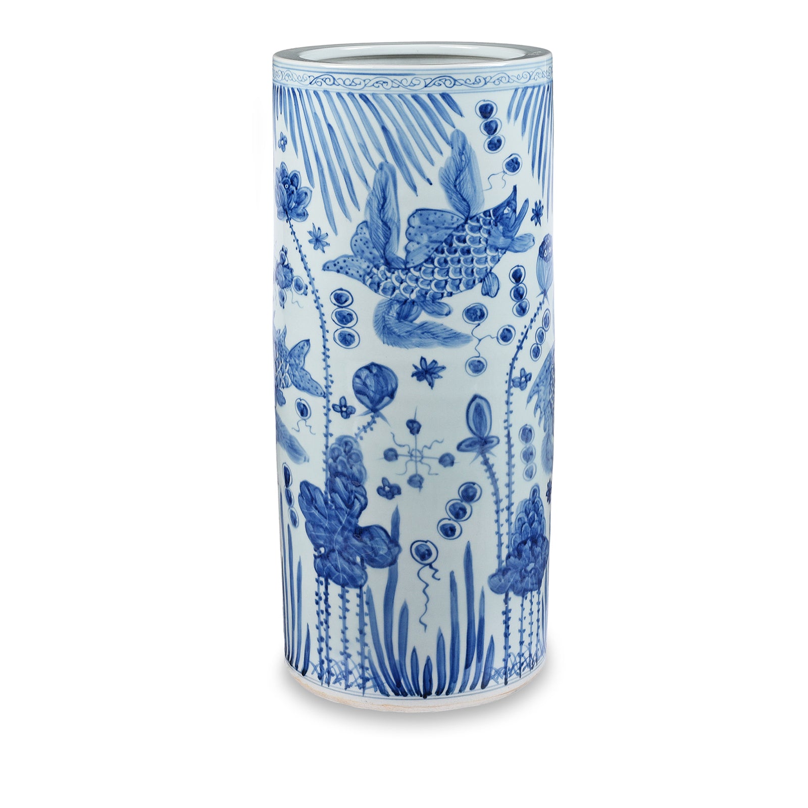 This Blue and White Porcelain Umbrella Stand features a charming design of Fishes and Lotus leaves. It is handcrafted in small batches like all of our porcelain products. The skills used to create this stand have been passed down through generations from family elders, making it a true work of art.