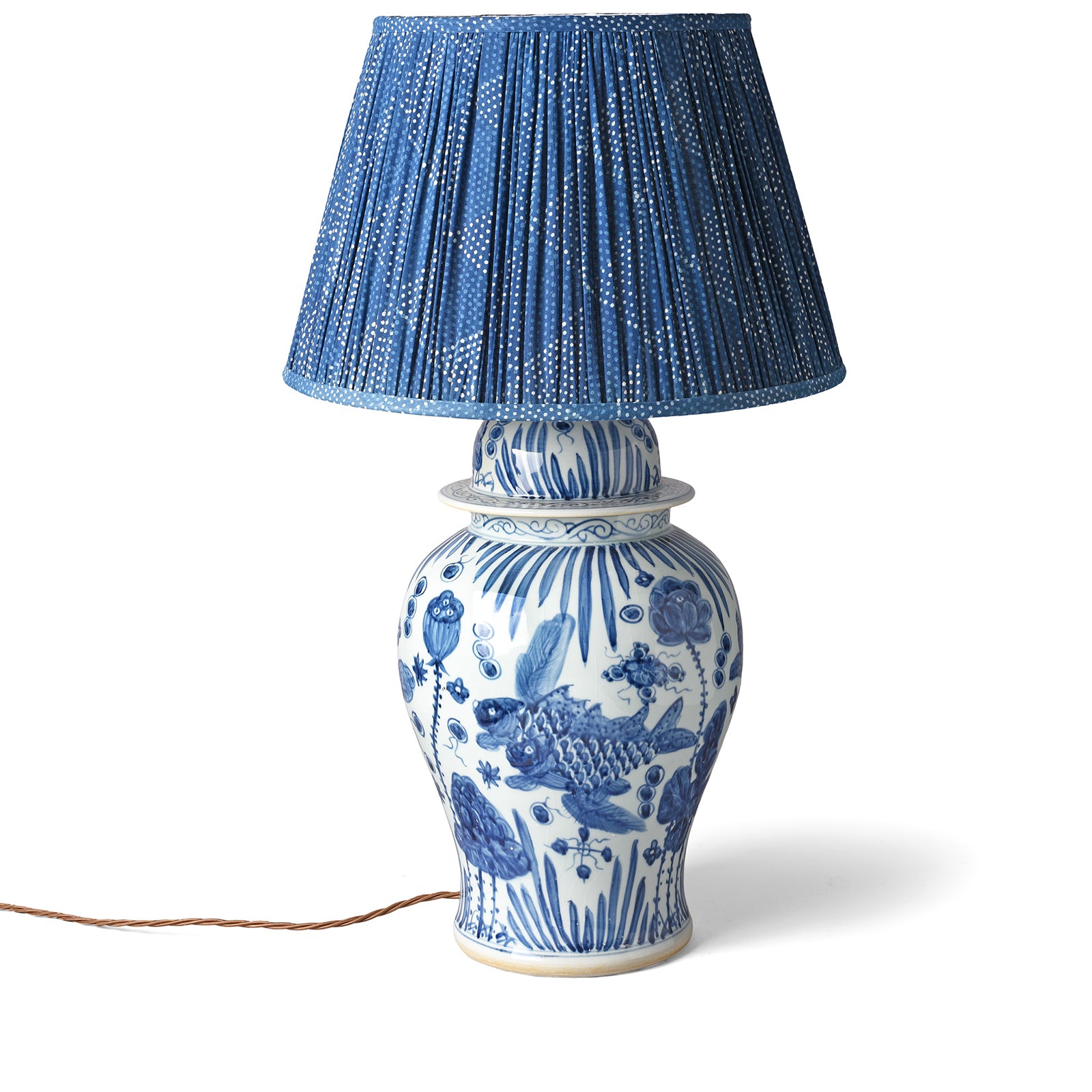 This Chinese porcelain temple jar is decorated with Lotus leaves and Fish, and has been converted into a spectacular lamp. The jar is hand made on the potters wheel in the traditional way. It is then decorated by hand before firing.