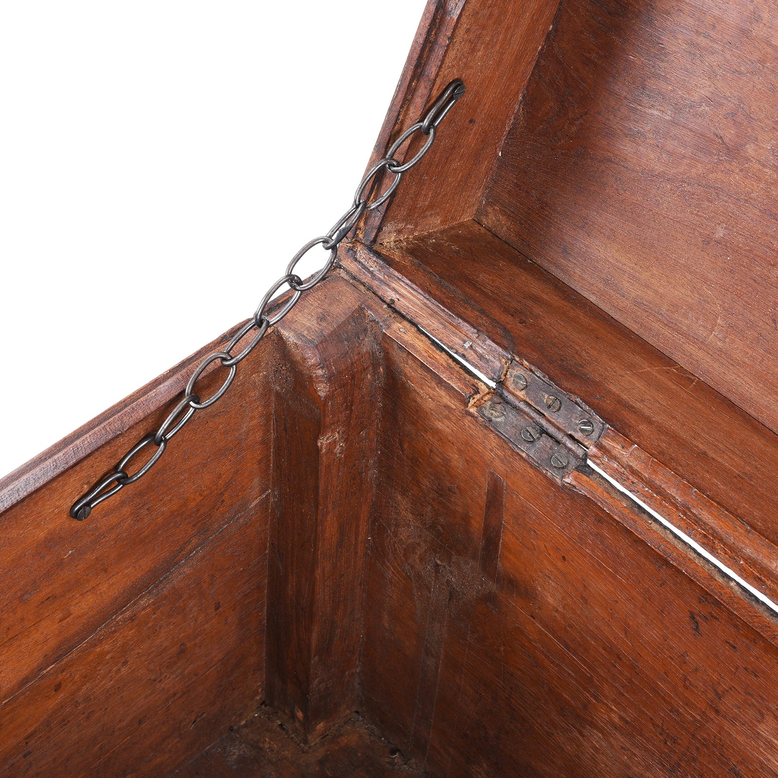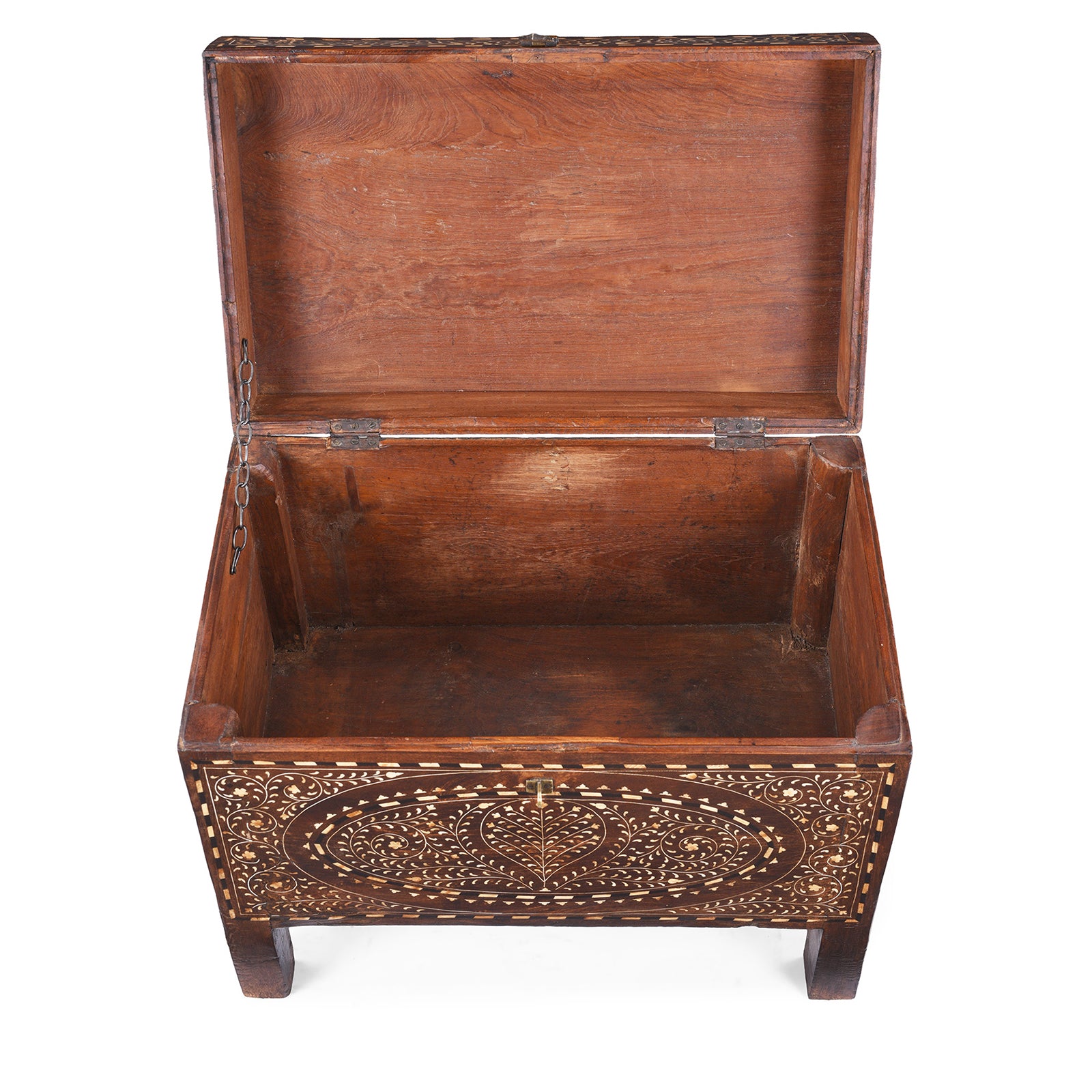 The intricate bone inlay work, added later, is carefully handcrafted in the traditional style€”featuring scrolling floral vines and geometric borders that speak to the legacy of skilled Indian artisanship. A rich, dark patina enhances the contrast between the natural teak grain and the delicate white inlay.